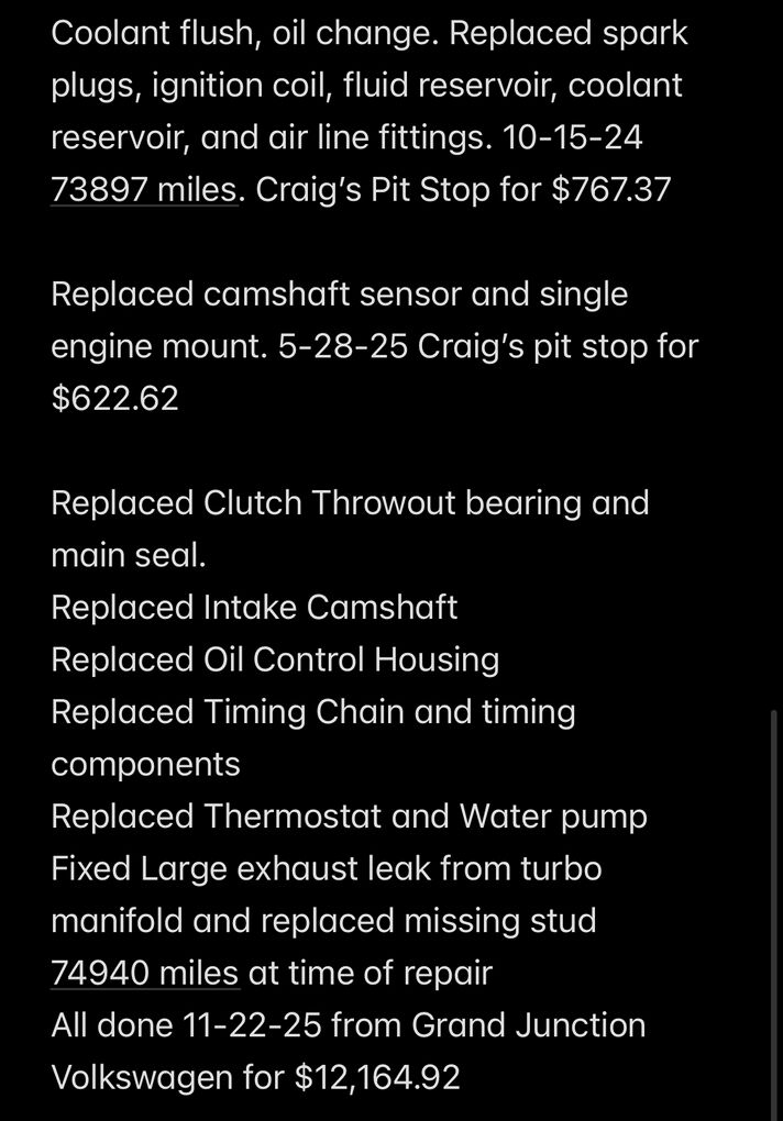 Pushing 15-20lbs of boost! Very fast little car. LIST OF ALL MODS IN PHOTOS. I bought it 8-24-24 with 72553 miles on it for $10,500. Such a nice-looking, fun car to drive, and it gets a lot of attention and sounds absolutely amazing. It does have some minor body damage(Paint Chips/Bondo chips). It had problems when I bought it, but I pumped a little over $14,000 into it, and I'm still having minor issues with it. I wish I could keep putting money into this car as much as I would love to, but I have more pressing concerns. I'm ready to pass this car on to someone who will put the love, time, and money into it that I don't have. I have proof and receipts of all services and repairs that have been made since I purchased it.