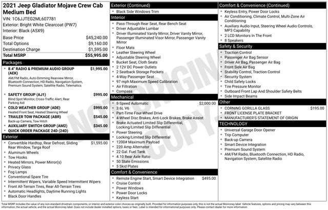 Get ready to hit the road in this Jeep Gladiator, a standout choice for drivers looking for reliability, performance, and style! This impressive vehicle is packed with premium features designed to make every drive more enjoyable. Plus, you’ll enjoy a $1,000 finance savings, already included in the sale price, when you finance through one of our trusted lending partners. Whether you’re searching for used cars in Salt Lake City, a dependable SUV, or a powerful truck, this Jeep Gladiator delivers everything you need and more. Visit Salt Lake Valley Chrysler Dodge Jeep Ram today to test drive or explore our entire selection of quality pre-owned vehicles. Don’t wait - shop online at www.slvcdjr.com or call 801-484-8755 to learn more! This amazing vehicle comes loaded with options like 8.4'' Radio & Premium Audio Group (1-Year SiriusXM Guardian Trial, 5-Year SiriusXM Traffic Service, 5-Year SiriusXM Travel Link Service, 8.4'' Touchscreen Display, Alpine Premium Audio System, Auto-Dimming Rear-View Mirror, Emergency/Assistance Call, For Details, Visit DriveUconnect.com, GPS Navigation, HD Radio, Radio: Uconnect 4C Nav w/8.4'' Display, SiriusXM Traffic Plus, and SiriusXM Travel Link), Auxiliary Switch Group (240 Amp Alternator, 700 Amp Maintenance Free Battery, and Auxiliary Switches), Cold Weather Group (Heated Front Seats and Heated Steering Wheel), Quick Order Package 24D, Safety Group (Blind Spot & Cross Path Detection and ParkSense Rear Park Assist System), Trailer Tow Package (Class IV Hitch Receiver, Heavy-Duty Engine Cooling, and Trailer Hitch Zoom), 4-Wheel Disc Brakes, 4.10 Rear Axle Ratio, 8 Speakers, 97 mph Maximum Speed Calibration, ABS brakes, Air Conditioning, Alloy wheels, AM/FM radio: SiriusXM, Apple CarPlay/Android Auto, Automatic temperature control, Black 3-Piece Hard Top, Brake assist, Compass, Corning Gorilla Glass, Delay-off headlights, Driver door bin, Driver vanity mirror, Dual front impact airbags, Dual front side impact airbags, Electronic Stability Control, Freedom Panel Storage Bag, Front anti-roll bar, Front Bucket Seats, Front Center Armrest w/Storage, Front dual zone A/C, Front fog lights, Front License Plate Bracket, Front reading lights, Fully automatic headlights, Garage door transmitter, Heated door mirrors, Heavy Duty Suspension w/Gas Shocks, Illuminated entry, Integrated roll-over protection, Leather steering wheel, Low tire pressure warning, Manufacturer's Statement of Origin, Occupant sensing airbag, Outside temperature display, Panic alarm, ParkView Rear Back-Up Camera, Passenger door bin, Passenger vanity mirror, Power door mirrors, Power steering, Power windows, Premium Cloth Seats w/Sport Bolsters, Radio data system, Radio: Uconnect 4 w/7'' Display, Rear anti-roll bar, Rear reading lights, Rear Sliding Window, Rear Window Defroster, Remote keyless entry, Remote Start System, Security system, Speed control, Split folding rear seat, Steering wheel mounted audio controls, Tachometer, Telescoping steering wheel, Tilt steering wheel, Traction control, Trip computer, Variably intermittent wipers, Voltmeter, and Wheels: 17'' x 7.5'' Low Gloss Black Aluminum, making it the perfect choice for your next adventure. Priced below KBB Fair Purchase Price!