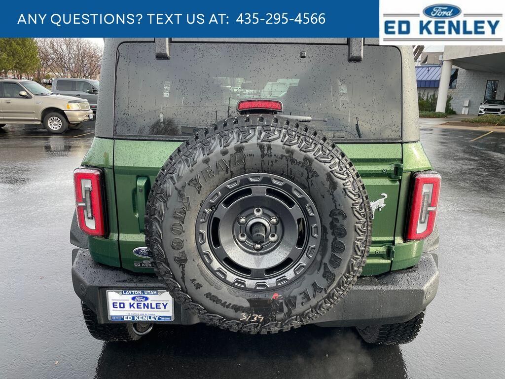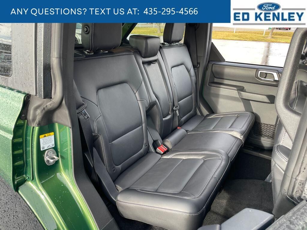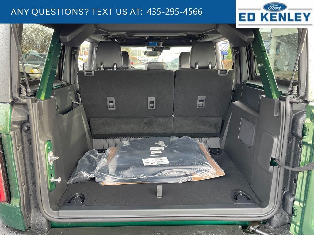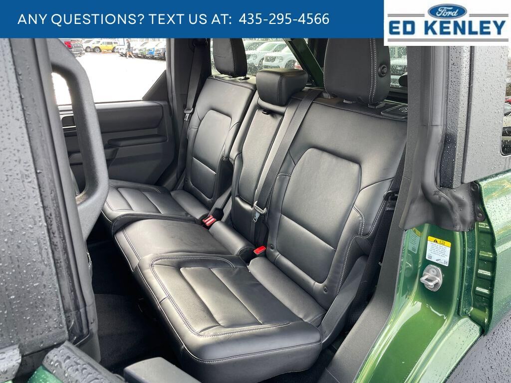 Equipment Group 312A Mid Package: 18" Bright Machined Aluminum Wheels; 3.73 Axle Ratio; 10-Speed Automatic Transmission; 2.3L EcoBoost I-4 Engine; P255/70R18 A/T Tires; 5,920 lbs GVWR; Heated Leather-Trimmed/vinyl Bucket Seats; AM/FM Stereo,Sasquatch Package: High Clearance Fender Flares; High Clearance Suspension; Position-Sensitive Bilstein Shock Absorbers,Carbonized Gray Molded-In-color Hard Top,Hard Top Sound Deadening Headliner,Eruption Green Metallic,Front and Rear Floor Liners Without Carpet Floor Mats,SYNC 4 AppLink/Apple CarPlay/Android Auto smart device wireless mirroring,Pre-Collision Assist with Pedestrian Detection,Pre-Collision Assist with Pedestrian Detection,FordPass Connect mobile hotspot internet access,Rear mounted camera,Lane-Keeping System,Predictive brake assist system,Cruise control with steering wheel mounted controls,Connected Navigation integrated navigation system with voice activation,Keyfob remote start,Heated steering wheel,Heated driver and front passenger seats,Leather and leatherette front seat upholstery,Manual convertible roof,Primary monitor touchscreen,Cross-Traffic Alert collision warning,First-row targa composite sunroof with manual activation,First-row targa composite sunroof with manual activation sunshade,Second-row targa composite sunroof with manual activation,Driver seat power reclining, lumbar support, cushion tilt, fore/aft control and height adjustable control,Second-row sunroof coverage,Part Time Selectable Engagement part-time 4WD,EcoBoost 2.3L I-4 gasoline direct injection, DOHC, Ti-VCT variable valve control, intercooled turbo, regular unleaded, engine with 275HP,EcoBoost 2.3L I-4 DOHC,SYNC 4 with Enhanced Voice Recognition (Alexa-Built-In) built-in virtual assistant,Driver Alert,MyKey restricted driving mode/alerts,Intelligent Access with hands-free access and push button start,Smart device remote start,Push-button,Bluetooth wireless audio streaming,Gauge cluster display size: 12.00,BLIS (Blind Spot Information System),Dual-zone front climate control,SYNC 4 with Enhanced Voice Recognition voice-activated climate control,Trail Control off-road speed control,Full gauge cluster screen,Bilstein remote reservoir shock absorbers,Auto High Beam auto high-beam headlights,Selectable Terrain Modes,Real-time traffic,SYNC 4 handsfree wireless device connectivity,Trailer sway control,SYNC 4 external memory control,Internet radio capability,Digital/analog instrumentation display,Configurable instrumentation gauges,AdvanceTrac w/Roll Stability Control electronic stability control system with anti-roll