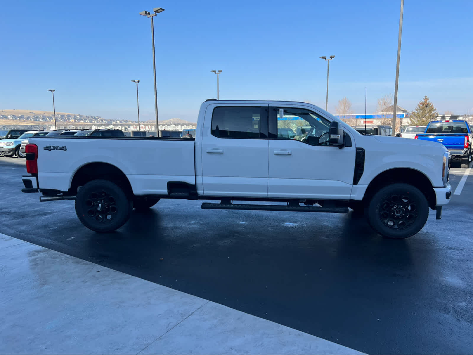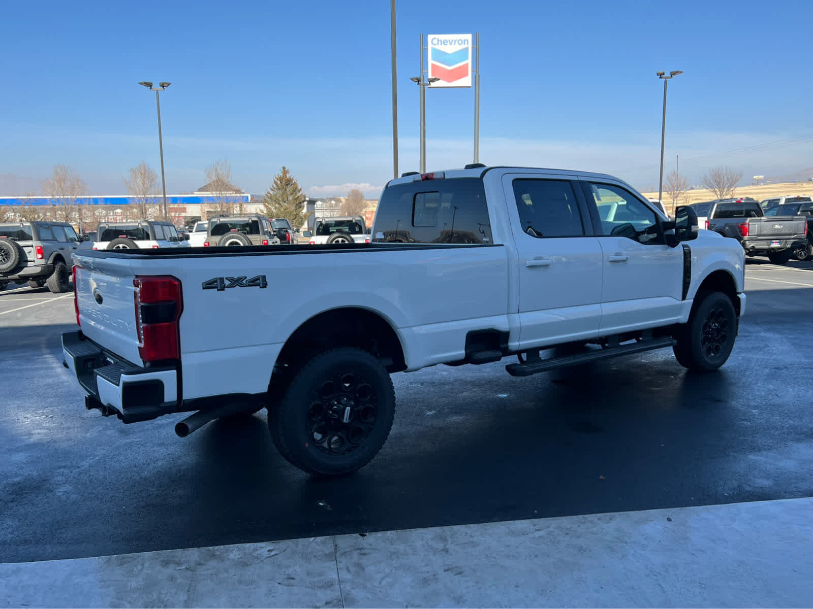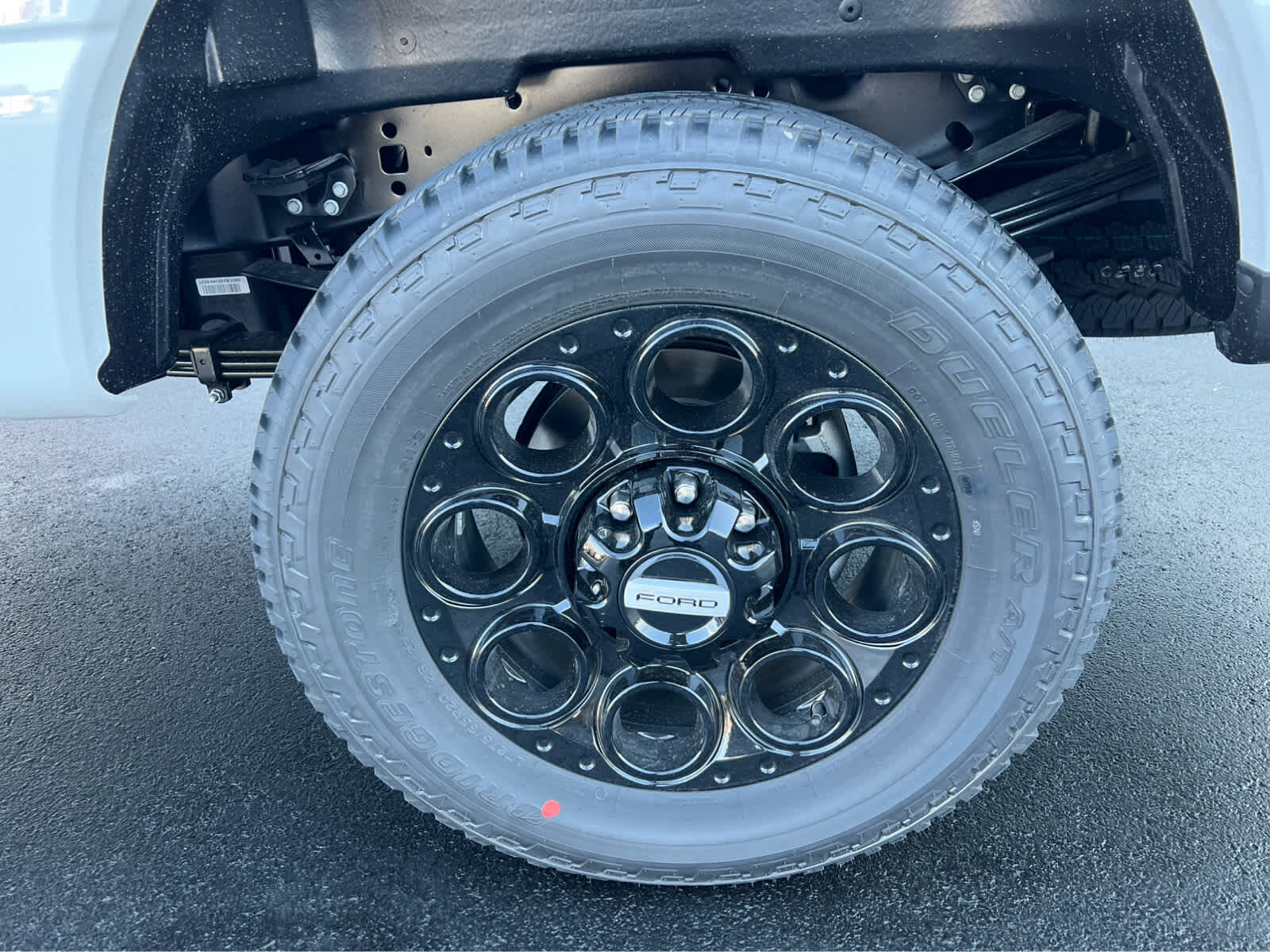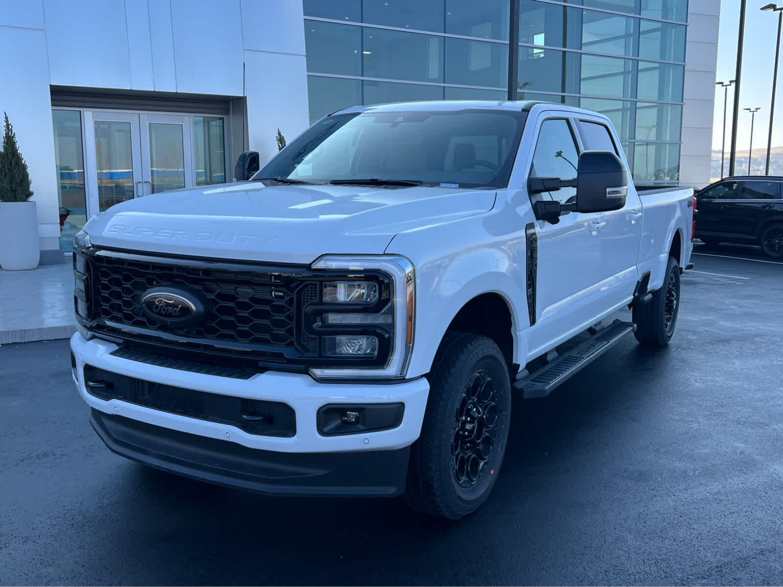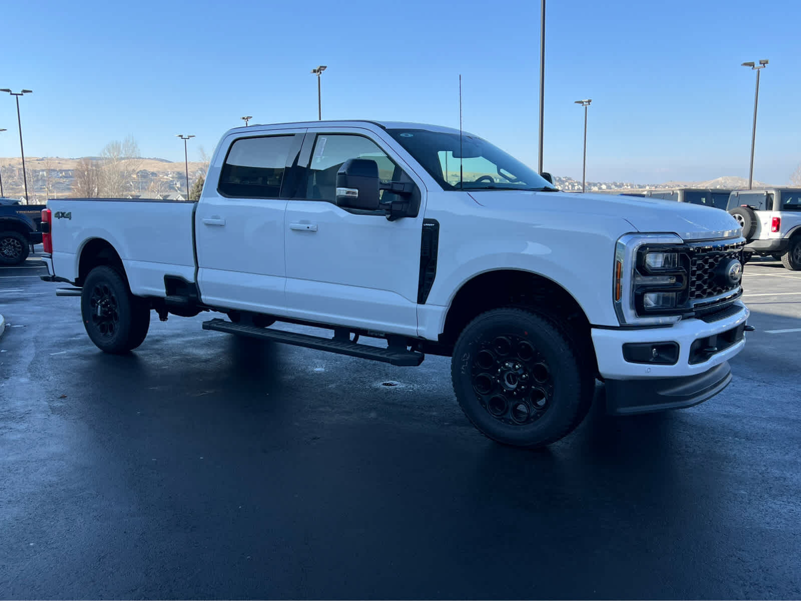 BLACK APPEARANCE PACKAGE front and rear black Ford ovals, box side decal (4x4, FX4 or Tremor) and ebony black fender vent surround dark fender badge, Rear Wheel Well Liners, Black Painted Front Grille Surround, Ebony Black Painted Mirror Caps, Tough Bed Spray-In Bedliner, tailgate-guard, black box bed tie-down hooks and black bed attachment bolts, Body Color Front & Rear Bumpers, Wheels: 20 Ebony Black High Gloss, Black premium painted aluminum, gloss black hub cover/center ornament, Tires: LT275/65Rx20E BSW Automatic Transmission (4), Spare may not be the same as road tire, 6 Ebony Black Angular Running Boards, LARIAT PREMIUM PACKAGE lane departure warning, Pro Trailer Hitch Assist, Ford Co-Pilot 360 Assist 2.0, rear view camera and reverse brake assist, Pre-Collision Assist, Automatic Emergency Braking (AEB), pedestrian detection, forward collision warning, dynamic brake support and intersection assist, Post-Collision Braking, Lane-Keeping System, lane-keeping alert, lane-keeping aid and driver alert, Front & Rear Parking Sensors, Automatic High Beam, Adaptive Cruise Control w/Stop-and-Go, lane centering and predictive speed assist, Power-Sliding Rear-Window w/Defrost, Pro Trailer Backup Assist, trailer reverse guidance, ENGINE: 7.3L 2V DEVCT NA PFI V8 GAS Electronic-Locking w/3.73 Axle Ratio, TWIN PANEL POWER MOONROOF map lights and moonroof switches, TAILGATE STEP & HANDLE, TRANSMISSION: TORQSHIFT 10-SPEED AUTOMATIC SelectShift and selectable drive modes: normal, eco, slippery roads, tow/haul and off-road.