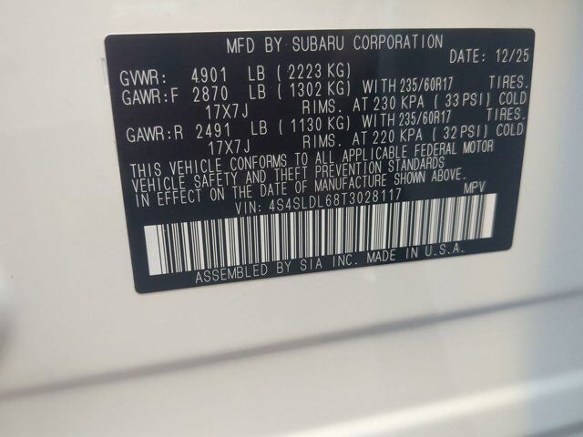CRYSTAL WHITE PEARL,GRAY TEXTURED STARTEX UPHOLSTERY -inc: silver and copper stitching and embossed Subaru Wilderness logo on head restraints,WILDERNESS PACKAGE -inc: Auto-Dimming Mirror w/Compass & HomeLink Part number H501SAN000 Rear Bumper Cover Part number E771SSL300 Auto-Dimming Exterior Mirror w/Approach Light Part number J201SFN001,HARMAN/KARDON SPEAKER SYSTEM & POWER REAR GATE -inc: Power Rear Gate automatic close and height memory hand pressure sensing automatic close and illuminated close and lock switch Radio: Subaru 11.6 Multimedia Navigation System valet mode integrated center information display AM/FM stereo HD Radio multitouch gesture high resolution display screen voice activated controls voice activated navigation Bluetooth audio streaming and hands-free phone connectivity w/SMS text messaging (refer to Subaru.com for cellphone compatibility) TomTom navigation software w/what3words iPod control capability smartphone integration: Android Auto and Apple CarPlay w/full screen view and wireless connection USB and Over The Air (OTA) audio system update USB and Map Over The Air (MOTA) TomTom navigation system update (3 years free map updates) steering wheel controls harman/kardon speaker system w/11 speakers and 576 watt equivalent maximum output amplifier 3.5mm auxiliary input jack and ro,All Wheel Drive,Power Steering,ABS,4-Wheel Disc Brakes,Brake Assist,Brake Actuated Limited Slip Differential,Aluminum Wheels,Tires - Front All-Terrain,Tires - Rear All-Terrain,Conventional Spare Tire,Sun/Moonroof,Generic Sun/Moonroof,Panoramic Roof,Heated Mirrors,Power Mirror(s),Integrated Turn Signal Mirrors,Rear Defrost,Privacy Glass,Intermittent Wipers,Variable Speed Intermittent Wipers,Rain Sensing Wipers,Rear Spoiler,Power Door Locks,Daytime Running Lights,Automatic Headlights,Headlights-Auto-Leveling,LED Headlights,Automatic Highbeams,Fog Lamps,AM/FM Stereo,Satellite Radio,MP3 Capability,Steering Wheel Audio Controls,Bluetooth Connection,Auxiliary Audio Input,HD Radio,Smart Device Integration,Requires Subscription,MP3 Capability,Bluetooth Connection,Power Driver Seat,Bucket Seats,Heated Front Seat(s),Driver Adjustable Lumbar,Pass-Through Rear Seat,Rear Bench Seat,Adjustable Steering Wheel,Trip Computer,Power Windows,WiFi Hotspot,Keyless Entry,Power Door Locks,Keyless Entry,Power Door Locks,Keyless Start,Cruise Control,Adaptive Cruise Control,Climate Control,Multi-Zone A/C,A/C,Premium Synthetic Seats,Driver Vanity Mirror,Passenger Vanity Mirror,Driver Illuminated Vanity Mirror,Passenger Illuminated Visor Mirror,Floor Mats,Cargo Shade,Keyless Start,Smart Device Integration,Power Door Locks,Power Windows,Trip Computer,Security System,Immobilizer,Cruise Control Steering Assist,Traction Control,Stability Control,Traction Control,Front Side Air Bag,Front Collision Mitigation,Driver Monitoring,Telematics,Requires Subscription,Blind Spot Monitor,Lane Departure Warning,Lane Keeping Assist,Lane Departure Warning,Evasion Assist,Cross-Traffic Alert,Rear Collision Mitigation,Tire Pressure Monitor,Driver Air Bag,Passenger Air Bag,Front Head Air Bag,Rear Head Air Bag,Passenger Air Bag Sensor,Knee Air Bag,Child Safety Locks,Back-Up Camera