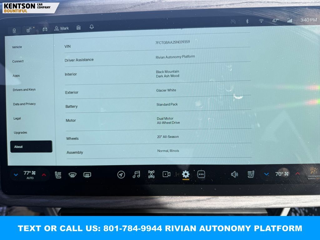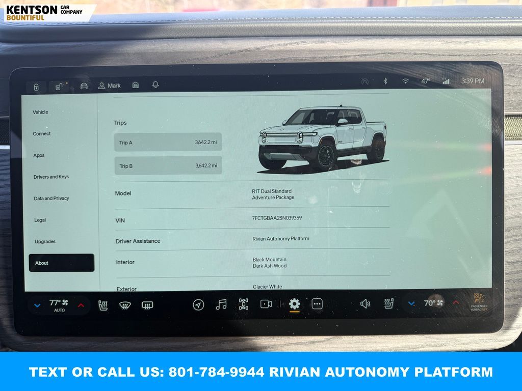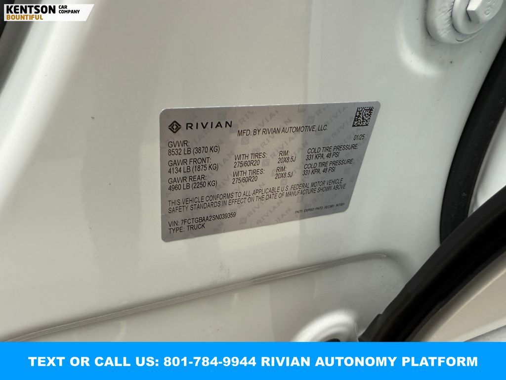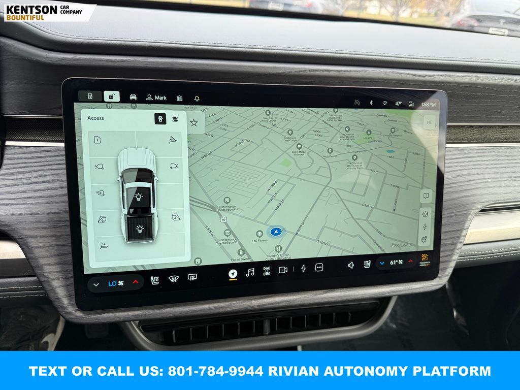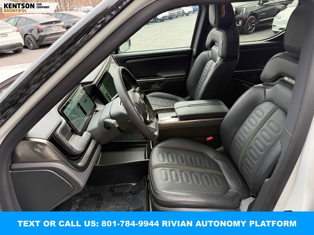360 Degree Camera, Adaptive Cruise Control, Backup Camera, Blind Spot Monitor, Heated Seats, Panoramic Sunroof, Parking Sensors, Power Seats, Rear Heated Seats, Rear Climate Control, Steering Wheel Audio Controls, Sunroof, Touch Screen, Rivian Autonomy Platform (RAP), ABS brakes, Active Cruise Control, Alloy wheels, Electronic Stability Control, Emergency communication system, Front dual zone A/C, Heated door mirrors, Heated front seats, Heated rear seats, Illuminated entry, Low tire pressure warning, Navigation System, Rear dual zone A/C, Traction control.