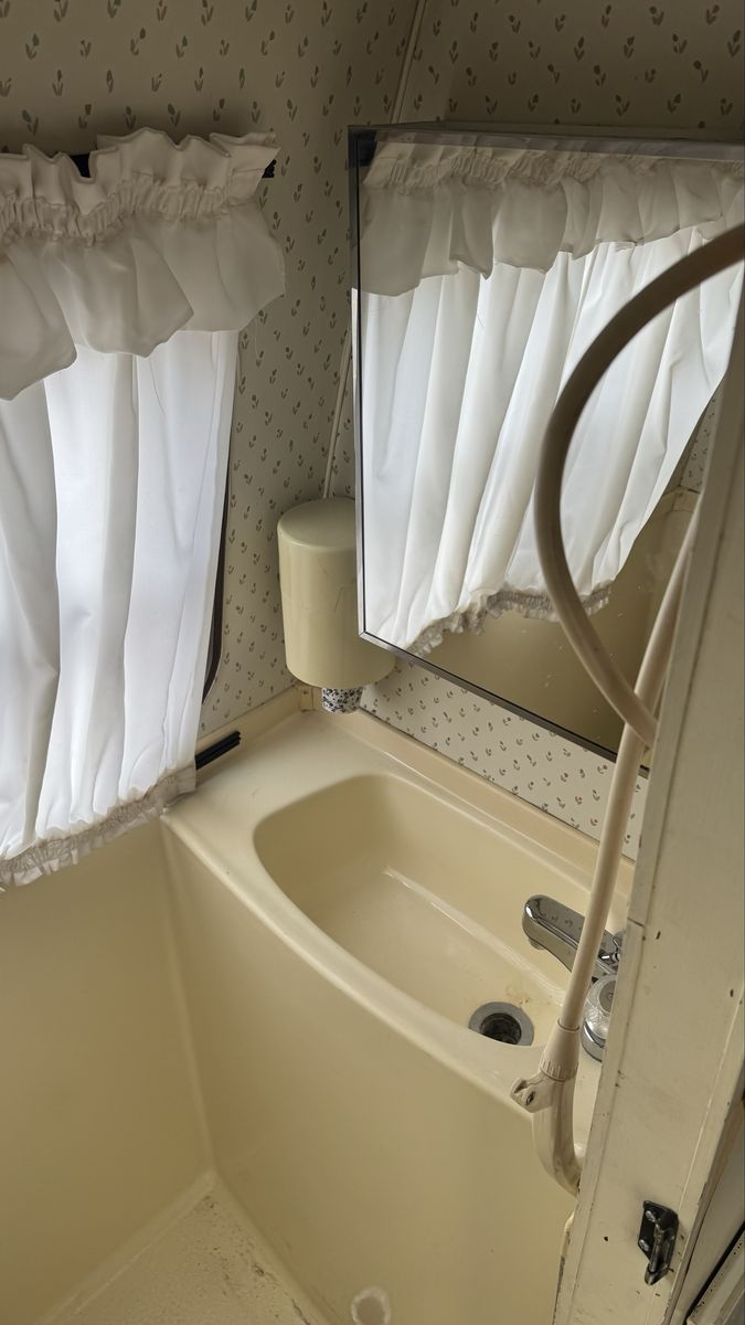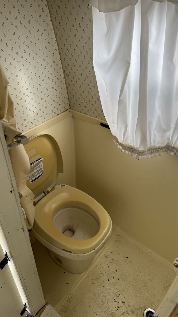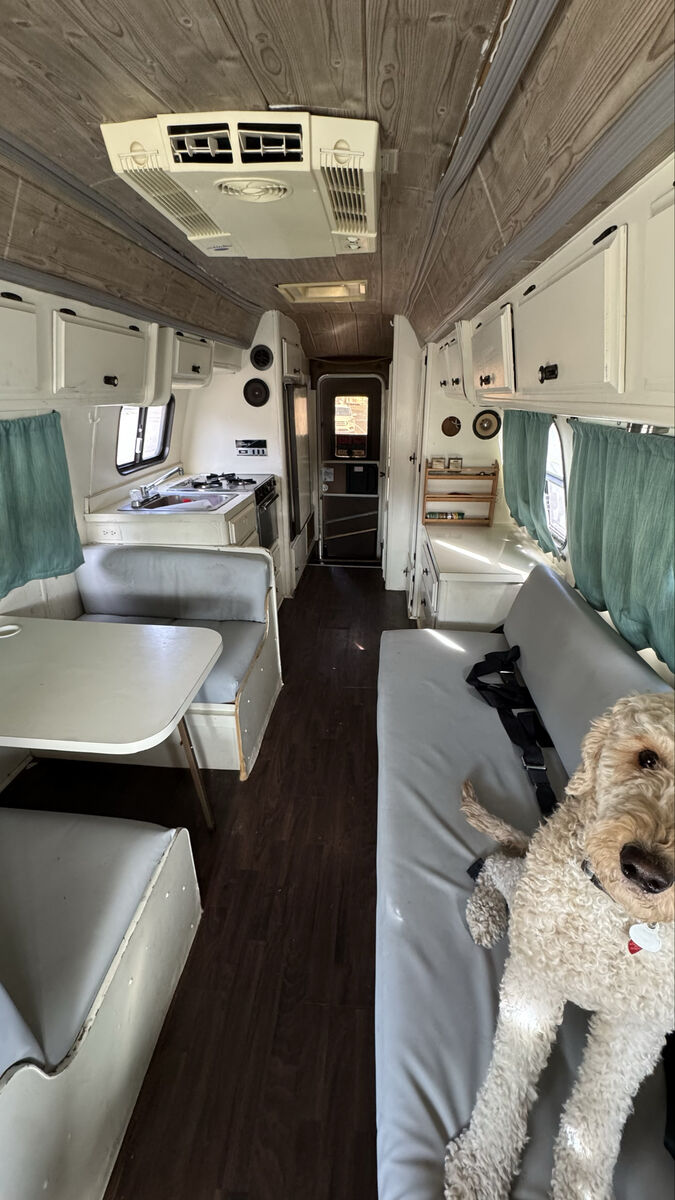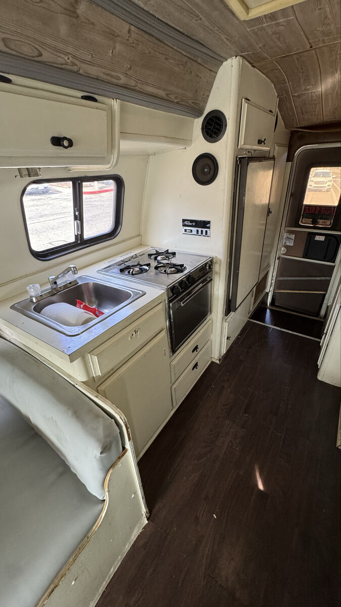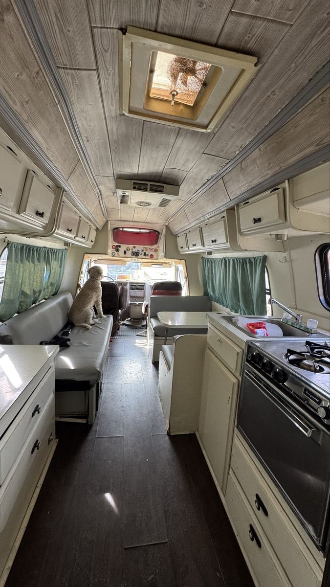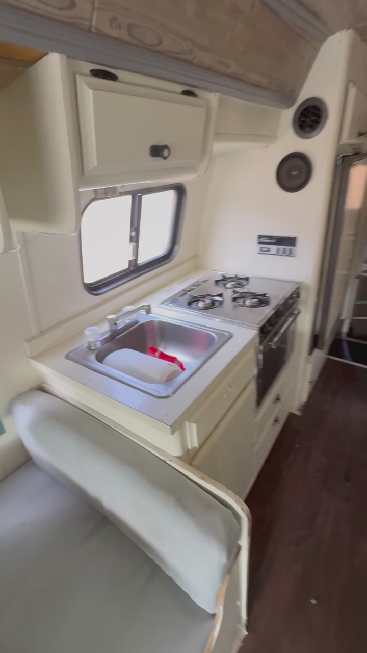 Bench seating converts to a bed, booth style table also converts to a bed. It has kitchen sink, stove, oven, refrigerator / freezer, bathroom toilet, sink, shower, tons of storage.