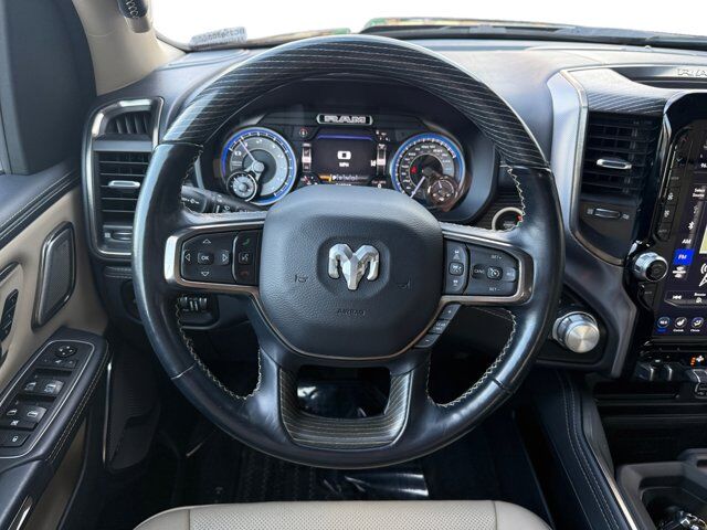 3.92 REAR AXLE RATIO,DIAMOND BLACK CRYSTAL PEARLCOAT,LIMITED LEVEL 1 EQUIPMENT GROUP -inc: Adaptive Cruise Control w/Stop & Go Parallel & Perp Park Assist w/Stop Ventilated Rear Seats Full Speed Forward Collision Warning Plus Lane Keep Assist,TIRES: 275/55R20 BSW ALL SEASON (STD),BED UTILITY GROUP -inc: 4 Adjustable Cargo Tie-Down Hooks Pick-Up Box Lighting Deployable Bed Step,QUICK ORDER PACKAGE 25M LIMITED -inc: Engine: 5.7L V8 HEMI MDS VVT Transmission: 8-Speed Automatic (8HP75),GVWR: 7 100 LBS,DUAL-PANE PANORAMIC SUNROOF -inc: LED Dome/Reading Lamp Dome Dual LED Reading Lamp,INDIGO/FROST PREMIUM LEATHER TRIMMED BUCKET SEATS,TRANSMISSION: 8-SPEED AUTOMATIC (8HP75),33 GALLON FUEL TANK,ENGINE: 5.7L V8 HEMI MDS VVT -inc: Active Noise Control System Heavy Duty Engine Cooling GVWR: 7 100 lbs Dual Rear Exhaust w/Bright Tips Hemi Badge 220 Amp Alternator 600W Engine Cooling Fan,TRAILER BRAKE CONTROL,ANTI-SPIN DIFFERENTIAL REAR AXLE,WHEELS: 20 X 9 POLISHED W/INSERTS (STD),Four Wheel Drive,Tow Hitch,Air Suspension,Power Steering,Air Suspension,Air Suspension,ABS,4-Wheel Disc Brakes,Brake Assist,Lithium Ion Traction Battery,Aluminum Wheels,Tires - Front Performance,Tires - Rear Performance,Bed Liner,Conventional Spare Tire,Tow Hooks,Heated Mirrors,Power Mirror(s),Integrated Turn Signal Mirrors,Power Folding Mirrors,Rear Defrost,Privacy Glass,Intermittent Wipers,Variable Speed Intermittent Wipers,Rain Sensing Wipers,Running Boards/Side Steps,Power Retractable Running Boards,Power Door Locks,Fog Lamps,Daytime Running Lights,Automatic Headlights,LED Headlights,Automatic Highbeams,AM/FM Stereo,Navigation System,Satellite Radio,Bluetooth Connection,HD Radio,Requires Subscription,Premium Sound System,MP3 Capability,Steering Wheel Audio Controls,Auxiliary Audio Input,Premium Sound System,Bluetooth Connection,Power Driver Seat,Power Passenger Seat,Mirror Memory,Driver Adjustable Lumbar,Seat Memory,Heated Front Seat(s),Cooled Front Seat(s),Power Driver Seat,Driver Adjustable Lumbar,Power Passenger Seat,Passenger Adjustable Lumbar,Pass-Through Rear Seat,Heated Rear Seat(s),Rear Bench Seat,Adjustable Steering Wheel,Trip Computer,Power Windows,WiFi Hotspot,Leather Steering Wheel,Heated Steering Wheel,Keyless Entry,Power Door Locks,Keyless Entry,Power Door Locks,Keyless Start,Universal Garage Door Opener,Cruise Control,Climate Control,Multi-Zone A/C,A/C,Woodgrain Interior Trim,Leather Seats,Bucket Seats,Auto-Dimming Rearview Mirror,Driver Vanity Mirror,Passenger Vanity Mirror,Driver Illuminated Vanity Mirror,Passenger Illuminated Visor Mirror,Floor Mats,Remote Engine Start,Smart Device Integration,Requires Subscription,Navigation System,Mirror Memory,Seat Memory,Remote Engine Start,Keyless Start,Smart Device Integration,Power Windows,Power Door Locks,Adjustable Pedals,Trip Computer,Immobilizer,Security System,Traction Control,Stability Control,Traction Control,Front Side Air Bag,Rear Parking Aid,Telematics,Requires Subscription,Blind Spot Monitor,Cross-Traffic Alert,Tire Pressure Monitor,Driver Air Bag,Passenger Air Bag,Front Head Air Bag,Rear Head Air Bag,Passenger Air Bag Sensor,Child Safety Locks,Back-Up Camera