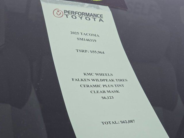 This New 2025 Toyota Tacoma TRD Off-Road is loaded with convenient features like 4X4, TURBO ENGINE, BACKUP-CAMERA, BLUETOOTH, WIFI, ALUMINUM WHEELS, BLIND SPOT MONITOR, REMOTE ENTRY, FOG LAMPS, LANE DEPARTURE WARNING.This vehicle comes equipped with the following dealer installed option(s):KMC WHEELS, FALKEN WILDPEAK TIRES: $4,100----------------------------------------CERAMIC TINT PLUS, CLEAR SHIELD : $2,023This stunning 2025 Toyota Tacoma TRD Off-Road located in Bountiful, UT features a beautiful Underground exterior and a Fd12 interior.Compare, adjust and save your payment options on every New Toyota vehicle in stock at:ToyotaBountiful.com!Technology and Entertainment Features Include: GPS System, WiFi Mobile Hotspot, Keyless Start, Bluetooth Connection, SiriusXM Satellite Radio, Smart Device Integration, HD Radio, Keyless Entry and Automatic Climate Control, Cloth Seats, Leather Wrapped Steering Wheel, Adjustable Lumbar Seats, Air Conditioning, Bucket Front Seats, Driver Illuminated Vanity Mirror, Pass-Through Rear Seat, Steering Wheel Audio Controls, Auto Dimming R/V Mirror, Passenger Illuminated Visor Mirror, AM/FM Stereo, Bench Seats, Tilt Steering Wheel, Rear Window Defroster, Floor Mats, Vanity Mirrors, Auxiliary Audio Input, Trip OdometerSafety and Economy Features Include: Back-Up Camera, Electronic Stability Control, Lane Keeping Assist System, Blind Spot Monitoring, Cross Traffic Alerts, Adaptive Cruise Control, Cruise Control Steering Assist, Front Collision Mitigation, Brake Assist, LED Headlights, Daytime Running Lights, Integrated Turn Signal Mirrors, Security System, Tire Pressure Monitoring System, ABS Brakes, Rear Air Bag, Knee AirBag, Drivers Air Bag, Child Proof Locks, Passenger Air Bag Sensor, Front Head Air Bag, Driver Front Side Impact Air BagWarranties Include: Basic warranty of 36 months/36,000 miles, whichever occurs first, from the date of first use and covers all components other than normal wear and maintenance items. This warranty covers repairs and adjustments needed to correct defects in materials or workmanship or any part supplied by Toyota, subject to exceptions. Powertrain Coverage is?60 months/60,000 miles, whichever occurs first, from the date of first use?and includes?engine, transmission/transaxle, front-wheel-drive system and rear-wheel drive system.*This vehicle has an EPA rated fuel economy of 23.0 highway / 19.0 city1.Toyota Bountiful proudly offers our customers many at-home services including Performance Valet! When you purchase from Toyota Bountiful, you will be eligible for FREE Pickup & Delivery^ for your future service appointments! We value your time and that's why we want to give you the best buying and service experiences in the Bountiful area! Also, ask your product specialist about our home test drives and deliveries. Save time and money through our exclusive Performance Remote Services! Distance limitations may apply.Our dealership is conveniently located off Exit 315 on I-15, North of Salt Lake City. We proudly serve the communities of Bountiful, Centerville, North Salt Lake, Farmington, Salt Lake City, Kaysville, South Salt Lake, Layton, Canyon Rim, Millcreek, West Valley City, Murray, Holladay, Taylorsville, and Syracuse. As a proud member of the family-owned Performance Automotive Network, we have access to thousands of new and used vehicles. This gives us the ability to find the perfect vehicle to fit your needs and budget.Need financing assistance? Our strong, group-wide relationships with several lending institutions allow us to offer the most competitive rates! We will give you top-dollar for your trade or make you a cash offer if you'd prefer the convenience of selling us your vehicle directly.With our aggressive pricing strategy, most vehicles sell within the first few weeks, so please contact us ahead of time at 888-470-9126 to ensure this vehicle is still available and ready for your test drive.*We'll Put A Smile On Your Face! *1Based on EPA mileage ratings. Use for comparison purposes only. Your mileage will vary depending on driving conditions, how you drive and maintain your vehicle, etc.*Terms and conditions of warranties vary by brand and vehicle. See dealer for complete details or sign in to download a copy of your vehicle's warranty. Warranty may be restricted or denied if your vehicle or part has been modified, improperly maintained or removed.Delivery to door for Test Drive.