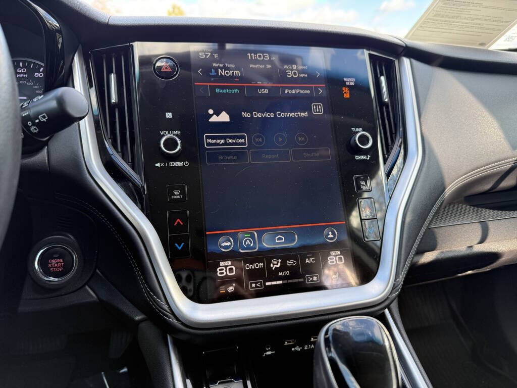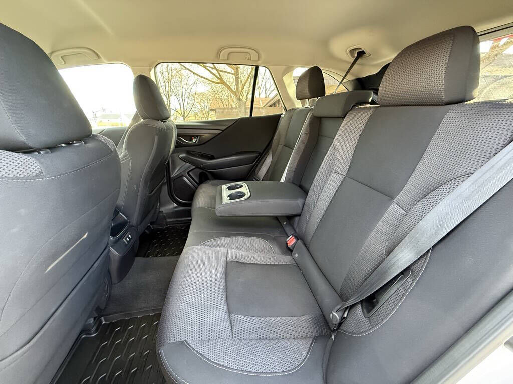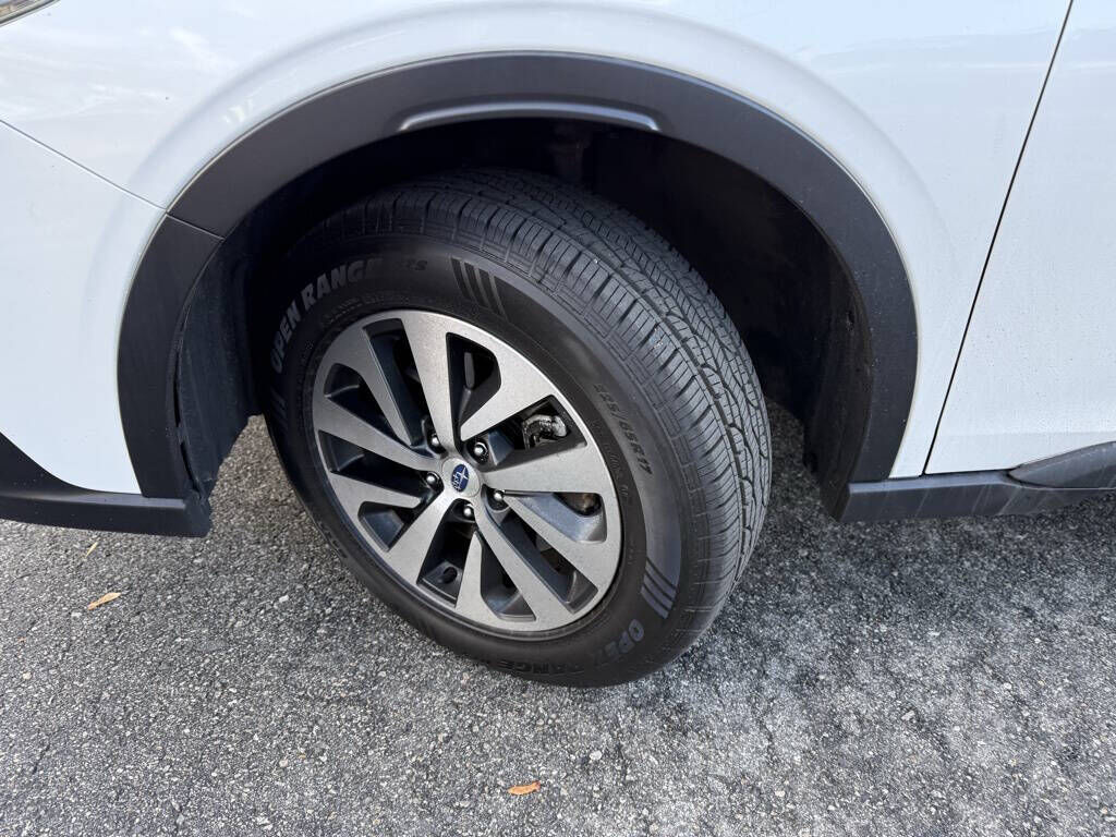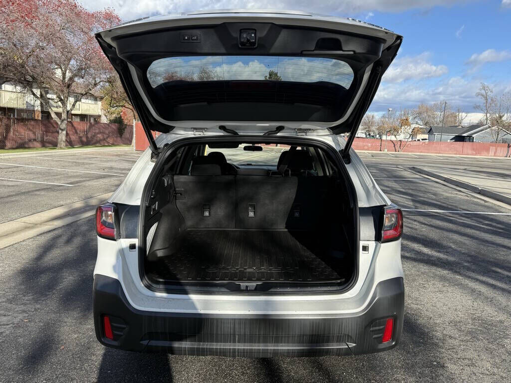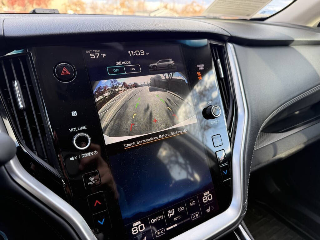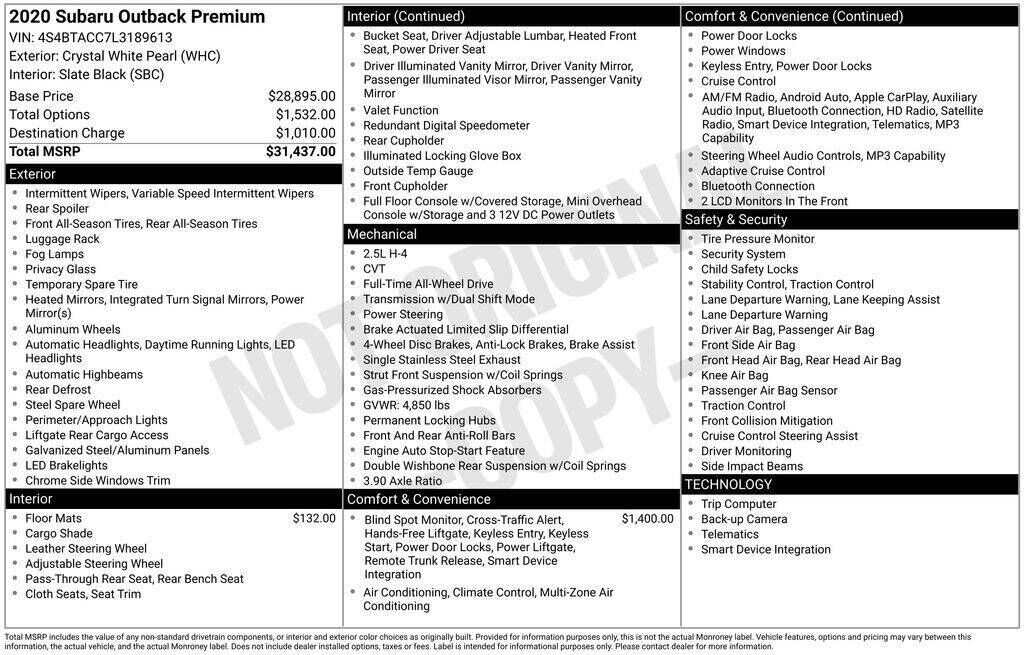 Crystal White Pearl 2020 Subaru Outback Premium AWD CVT Lineartronic 2.5L 4-Cylinder DOHC 16V 3.90 Axle Ratio, 4-Wheel Disc Brakes, 6 Speakers, ABS brakes, Air Conditioning, All-Weather Floor Liners, Alloy wheels, AM/FM radio: SiriusXM, Auto High-beam Headlights, Automatic temperature control, Blind Spot Detection (BSD), Brake assist, BSD w/RCTA & Keyless Access & Push Button Start, Bumpers: body-color, Cloth Upholstery, Driver door bin, Driver vanity mirror, Dual front impact airbags, Dual front side impact airbags, Electronic Stability Control, Emergency communication system: STARLINK Safety and Security (Subscription Required), Exterior Parking Camera Rear, Four wheel independent suspension, Front anti-roll bar, Front Bucket Seats, Front Center Armrest w/Storage, Front dual zone A/C, Front fog lights, Front reading lights, Fully automatic headlights, Hands-Free Power Rear Gate, Heated door mirrors, Heated Front Bucket Seats, Heated front seats, Illuminated entry, Keyless Access w/Push Button Start, Knee airbag, Low tire pressure warning, Occupant sensing airbag, Outside temperature display, Overhead airbag, Overhead console, Panic alarm, Passenger door bin, Passenger vanity mirror, Power door mirrors, Power driver seat, Power steering, Power windows, Radio: Subaru STARLINK 11.6'' Multimedia Plus Sys, Rear anti-roll bar, Rear Cross Traffic Alert (RCTA), Rear seat center armrest, Rear window defroster, Rear window wiper, Remote keyless entry, Roof rack, Security system, Speed control, Speed-sensing steering, Split folding rear seat, Spoiler, STARLINK/Apple CarPlay/Android Auto, Steering wheel mounted audio controls, Steering Wheel Paddle Shift Control Switches, Tachometer, Telescoping steering wheel, Tilt steering wheel, Traction control, Trip computer, Turn signal indicator mirrors, Variably intermittent wipers, Wheels: 17'' x 7J Black Aluminum Alloy.