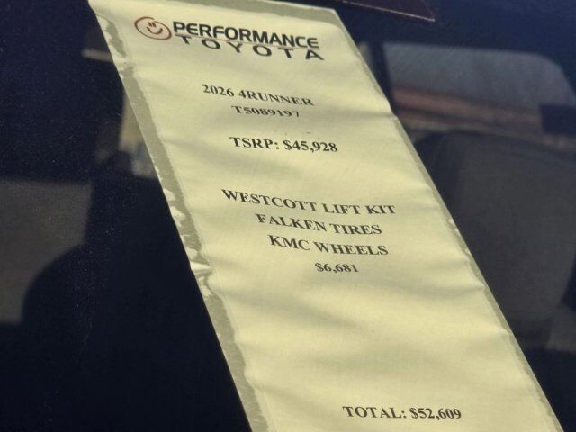 8 Speakers,AM/FM radio: SiriusXM,Radio: 8 Audio,Air Conditioning,Automatic temperature control,Front dual zone A/C,Rear window defroster,Power steering,Power windows,Remote keyless entry,Steering wheel mounted audio controls,Speed-sensing steering,Traction control,4-Wheel Disc Brakes,ABS brakes,Anti-whiplash front head restraints,Dual front impact airbags,Dual front side impact airbags,Emergency communication system: Safety Connect (1-year trial),Front anti-roll bar,Front wheel independent suspension,Knee airbag,Low tire pressure warning,Occupant sensing airbag,Overhead airbag,Rear anti-roll bar,Rear side impact airbag,Brake assist,Electronic Stability Control,Exterior Parking Camera Rear,Auto High-beam Headlights,Front fog lights,Panic alarm,Security system,Speed control,Bumpers: body-color,Front and Rear Molded Black 4Runner Mudguards,Front Color Keyed Door Edge Guards,Heated door mirrors,Power door mirrors,Rear Spoiler,4runner All Weather Floor Mats,4runner Carpet Cargo Mat,Apple CarPlay/Android Auto,Driver door bin,Driver vanity mirror,Emergency Assistance Kit,Front Integrated Dash Cam System,Front reading lights,Illuminated entry,Leather Shift Knob,Leather steering wheel,Multimedia Glass Screen Protector,Outside temperature display,Overhead console,Passenger vanity mirror,Rear seat center armrest,Tachometer,Telescoping steering wheel,Tilt steering wheel,Trip computer,Fabric Seat Trim (FA),Front Bucket Seats,Front Center Armrest,Split folding rear seat,Passenger door bin,Alloy wheels,Wheels: 17 Dark-Gray Painted Alloy,Rear window wiper,Variably intermittent wipers,PREMIUM PAINT,3/1 WESTCOTT LIFT,FALKEN WILDPEAK TIRES,KMC WHEELS
