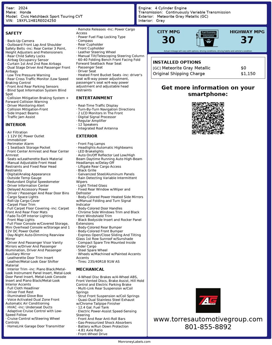 Under the hood- the powerful 1.5L 4-cylinder engine ensures a lively driving experience with impressive fuel efficiency. The CVT offers smooth and responsive handling- making it a pleasure to navigate both city streets and winding country roads. With its versatile hatchback design- ample cargo space- and state-of-the-art safety features- this Civic is perfectly suited for adventurous weekends or everyday commutes. Combining reliability and innovation- the 2024 Honda Civic Hatchback Sport Touring is an exceptional choice for those seeking a vehicle that meets both lifestyle and performance needs.