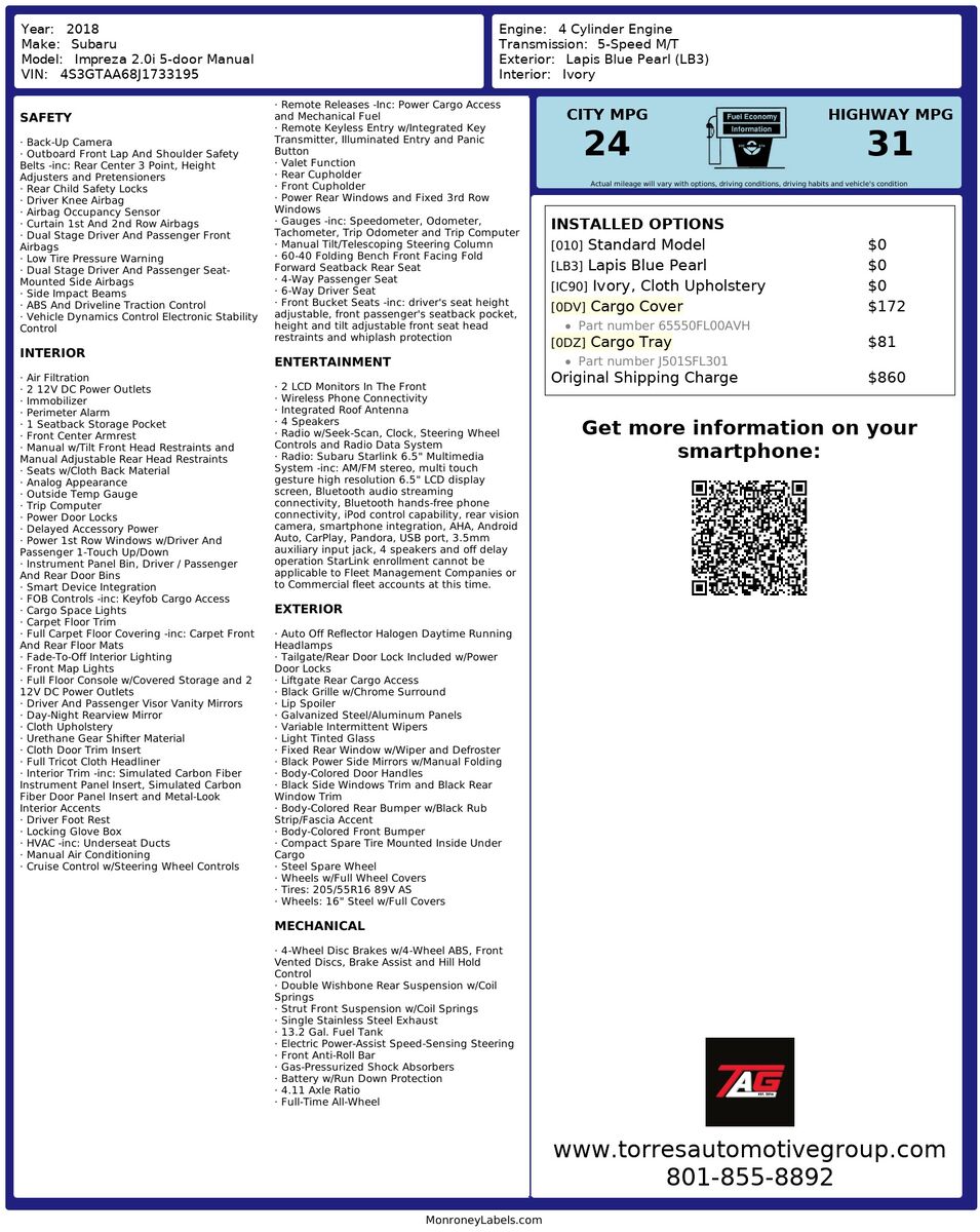 To enhance its practicality- the Impreza includes thoughtful features like a cargo cover and cargo tray- perfect for securing and organizing your belongings on the go. The standard model's versatile 5-door style allows for impressive cargo capacity- making it easy to accommodate both passengers and gear. With its blend of attractive aesthetics and functional design- the 2018 Subaru Impreza is a compelling choice for those seeking a well-rounded vehicle.
