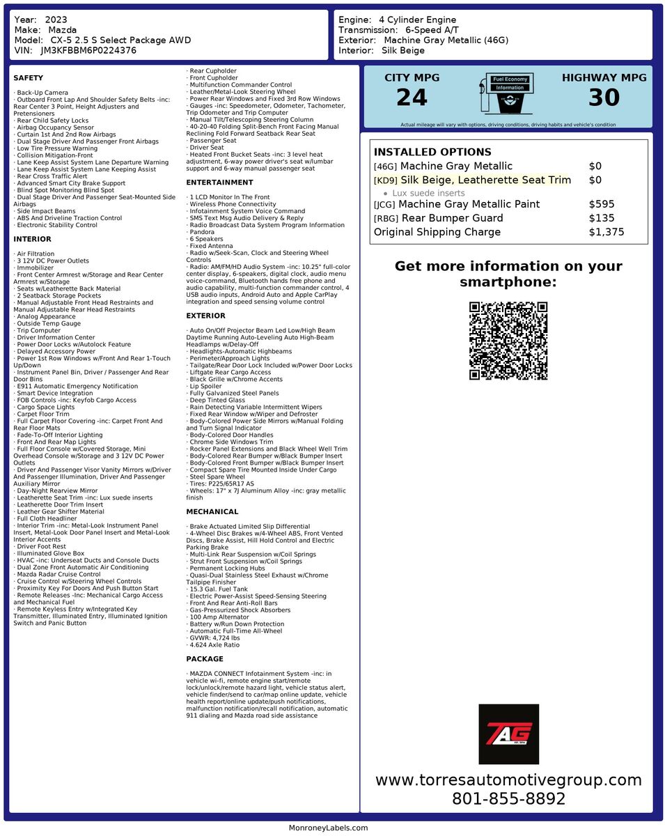 The 2.5 S Select Package AWD ensures superior traction and control with its all-wheel-drive system- allowing drivers to navigate diverse terrains with confidence. This CX-5 variant also emphasizes convenience and safety- including a suite of advanced features tailored to enhance the driving journey. Whether on the move or standing still- the distinct combination of Machine Gray Metallic paint and Silk Beige interior makes a statement of understated luxury and dynamic performance. Offering more than just an SUV- the 2023 Mazda CX-5 delivers an encompassing blend of technology and elegance in one irresistible package.
