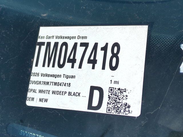 Opal White with Deep Black Roof 2026 Volkswagen Tiguan 2.0T SE R-Line Black AWD 8-Speed Automatic 2.0L TSI DOHC Bumperdillo Protection Plate in Black For Rear Bumper, Heavy Duty Trunk Liner with VW CarGo Blocks, Roadside Assistance Kit, Rubber Monster Mats Kit (set of 4), VW Care, 4-Wheel Disc Brakes, 4-Wheel Independent Suspension, 7 Speakers, ABS brakes, Air Conditioning, Alloy wheels, AM/FM radio: SiriusXM with 360L, Auto High-beam Headlights, Auto-dimming Rear-View mirror, Automatic temperature control, Brake assist, Bumpers: body-color, Compass, Delay-off headlights, Driver door bin, Driver vanity mirror, Dual front impact airbags, Dual front side impact airbags, Electronic Stability Control, Emergency communication system, Exterior Parking Camera Rear, First Aid Kit, Four wheel independent suspension, Front anti-roll bar, Front Bucket Seats, Front Center Armrest, Front dual zone A/C, Front reading lights, Fully automatic headlights, Heads-Up Display, Heated door mirrors, Heated Front Seats, Heated front seats, Illuminated entry, Knee airbag, Leather Shift Knob, Leather steering wheel, Low tire pressure warning, Occupant sensing airbag, Outside temperature display, Overhead airbag, Overhead console, Panic alarm, Passenger door bin, Passenger vanity mirror, Perforated V-Tex Leatherette Seating Surfaces, Power door mirrors, Power driver seat, Power Liftgate, Power moonroof: Panoramic, Power steering, Power windows, Radio data system, Radio: MIB4 Composition Media Touchscreen with AM/FM, Rain sensing wipers, Rear anti-roll bar, Rear reading lights, Rear seat center armrest, Rear side impact airbag, Rear window defroster, Rear window wiper, Remote keyless entry, Security system, Speed control, Speed-sensing steering, Split folding rear seat, Spoiler, Sport steering wheel, Steering wheel mounted audio controls, Tachometer, Telescoping steering wheel, Tilt steering wheel, Traction control, Trip computer, Turn signal indicator mirrors, Variably intermittent wipers, Wheels: 20 Black Painted Alloy, IQ.DRIVE, Bumperdillo Protection Plate in Black For Rear Bumper, Heavy Duty Trunk Liner with VW CarGo Blocks, Roadside Assistance Kit, Rubber Monster Mats Kit (set of 4), VW Care. $1,500 Financing Discount Included in all Discounts. Must allow Ken Garff VW to arrange financing. Must finance a minimum of 90% of MSRP. Not Valid with 0% or other subvented interest rates. Remaining Discounts are a Combination of Ken Garff Discounts and Remaining Manufacturer Rebates and Incentives. See dealer for complete details and limitations. $1000 - Customer Bonus. Exp. 03/02/2026