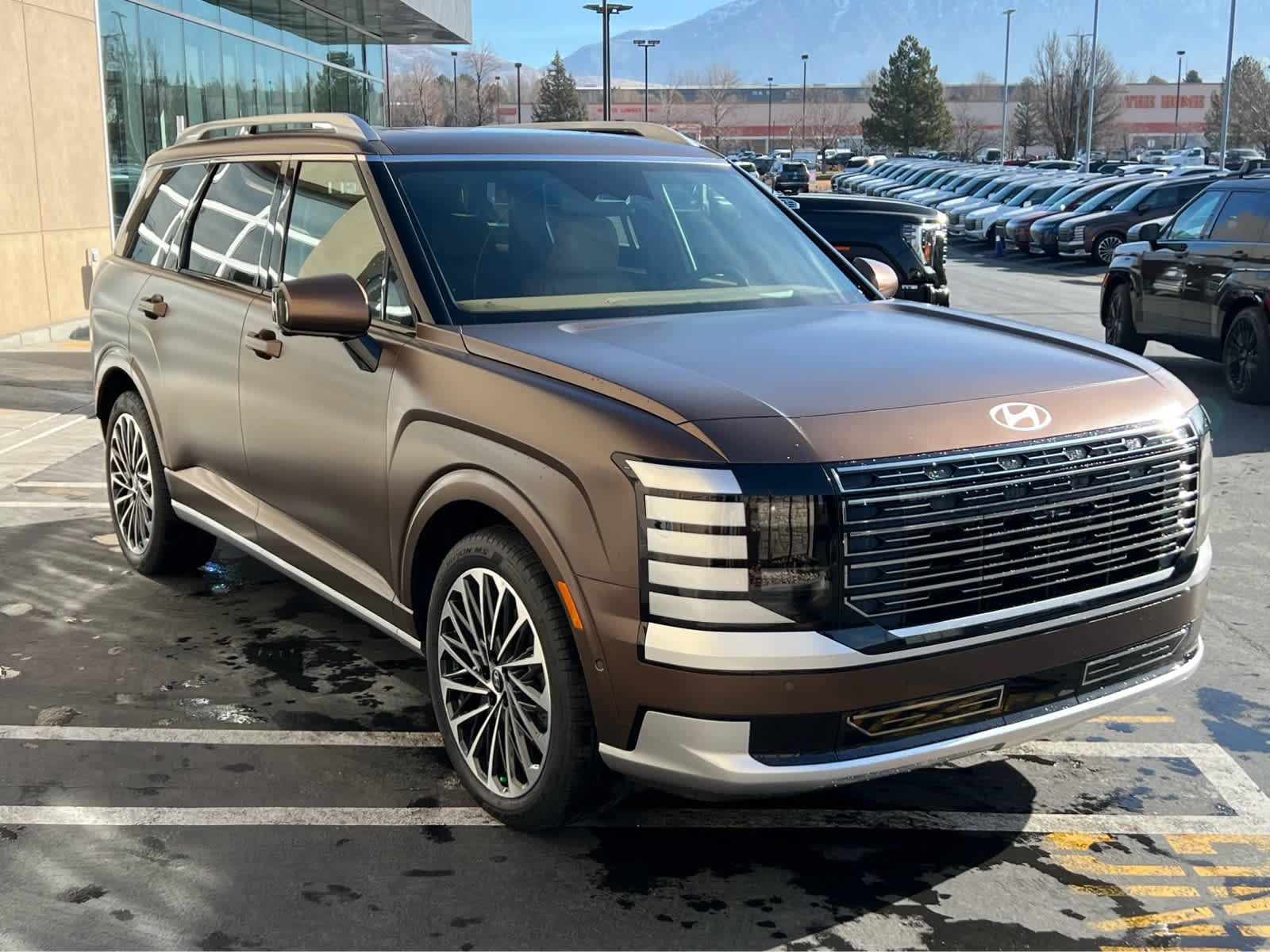 Leather Seats, Third Row Seat, Navigation, All Wheel Drive, Quad Bucket Seats, Power Liftgate, Rear Air, Heated Driver Seat. Rear Spoiler, MP3 Player, Rear Seat Audio Controls, Privacy Glass. Hyundai Calligraphy with Earthy Brass Matte exterior and Brown interior features a V6 Cylinder Engine with 287 HP at 5800 RPM*.