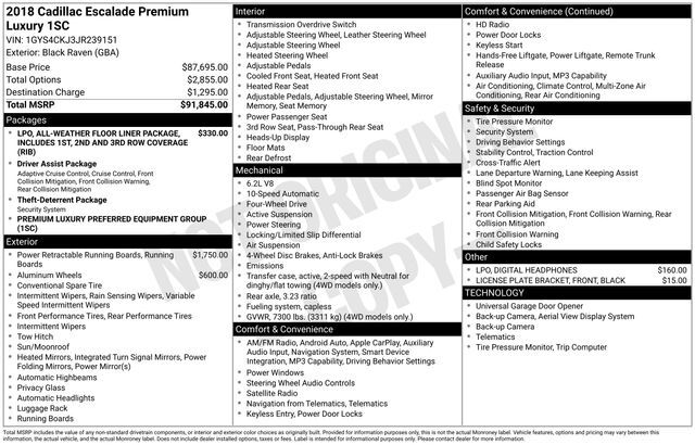 2018 Cadillac Escalade Premium Luxury Black Raven 4WD 10-Speed Automatic with Overdrive 6.2L Variable Valve Timing V8 SIDI
