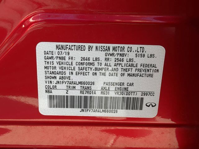 Navigation system: INFINITI InTouch Navigation,16 Speakers,AM/FM radio: SiriusXM,CD player,Radio data system,Radio: INFINITI InTouch w/Navigation,Air Conditioning,Automatic temperature control,Front dual zone A/C,Rear window defroster,Memory seat,Power driver seat,Power steering,Power windows,Remote keyless entry,Steering wheel memory,Steering wheel mounted audio controls,Adaptive suspension,Four wheel independent suspension,Traction control,4-Wheel Disc Brakes,ABS brakes,Dual front impact airbags,Dual front side impact airbags,Emergency communication system: INFINITI Connection,Front anti-roll bar,Low tire pressure warning,Occupant sensing airbag,Overhead airbag,Rear anti-roll bar,Power moonroof,Blind Spot Warning,Brake assist,Electronic Stability Control,Delay-off headlights,Front fog lights,Fully automatic headlights,Panic alarm,Security system,Speed control,Auto-dimming door mirrors,Bumpers: body-color,Exclusive Paint,Heated door mirrors,Power door mirrors,Turn signal indicator mirrors,Apple CarPlay/Android Auto,Auto tilt-away steering wheel,Auto-dimming Rear-View mirror,Compass,Driver door bin,Driver vanity mirror,Front reading lights,Garage door transmitter: HomeLink,Heated steering wheel,Illuminated entry,Leather Shift Knob,Leather steering wheel,Literature Kit,Outside temperature display,Overhead console,Passenger vanity mirror,Rear reading lights,Rear seat center armrest,Tachometer,Telescoping steering wheel,Tilt steering wheel,Trip computer,Front Bucket Seats,Front Center Armrest,Heated front seats,Heated Front Sport Seats,Power passenger seat,Quilted Semi-Aniline Leather Seating Surfaces,Split folding rear seat,Passenger door bin,Alloy wheels,Wheels: 19 inch x 9 inch Aluminum-Alloy Sport,Rain sensing wipers,Speed-Sensitive Wipers,Variably intermittent wipers,Bluetooth Wireless,USB Port(s),DYNAMIC SUNSTONE RED,GRAPHITE QUILTED SEMI-ANILINE LEATHER SEATING SURFACES -inc: red contrast stitching,[E09] EXCLUSIVE PAINT,[S55] LITERATURE KIT,Turbocharged,All Wheel Drive,Active Suspension,Power Steering,ABS,4-Wheel Disc Brakes,Brake Assist,Brake Actuated Limited Slip Differential,Aluminum Wheels,Tires - Front Performance,Tires - Rear Performance,Sun/Moonroof,Generic Sun/Moonroof,Heated Mirrors,Power Mirror(s),Integrated Turn Signal Mirrors,Rear Defrost,Intermittent Wipers,Variable Speed Intermittent Wipers,Rain Sensing Wipers,Daytime Running Lights,Automatic Headlights,LED Headlights,Fog Lamps,AM/FM Stereo,CD Player,Satellite Radio,MP3 Capability,Steering Wheel Audio Controls,Auxiliary Audio Input,HD Radio,Requires Subscription,Premium Sound System,MP3 Capability,Premium Sound System,Bluetooth Connection,Power Driver Seat,Power Passenger Seat,Bucket Seats,Driver Adjustable Lumbar,Heated Front Seat(s),Pass-Through Rear Seat,Rear Bench Seat,Adjustable Steering Wheel,Trip Computer,Power Windows,WiFi Hotspot,Leather Steering Wheel,Heated Steering Wheel,Keyless Entry,Power Door Locks,Keyless Start,Keyless Entry,Power Door Locks,Remote Trunk Release,Universal Garage Door Opener,Cruise Control,Climate Control,Multi-Zone A/C,A/C,Leather Seats,Auto-Dimming Rearview Mirror,Driver Vanity Mirror,Passenger Vanity Mirror,Driver Illuminated Vanity Mirror,Passenger Illuminated Visor Mirror,Floor Mats,Smart Device Integration,Mirror Memory,Seat Memory,Remote Engine Start,Keyless Start,Navigation System,Power Windows,Power Door Locks,Trip Computer,Pass-Through Rear Seat,Security System,Immobilizer,Traction Control,Stability Control,Traction Control,Front Side Air Bag,Front Collision Mitigation,Telematics,Requires Subscription,Rear Parking Aid,Blind Spot Monitor,Cross-Traffic Alert,Rear Collision Mitigation,Aerial View Display System,Tire Pressure Monitor,Driver Air Bag,Passenger Air Bag,Front Head Air Bag,Rear Head Air Bag,Passenger Air Bag Sensor,Child Safety Locks,Driver Restriction Features,Back-Up Camera