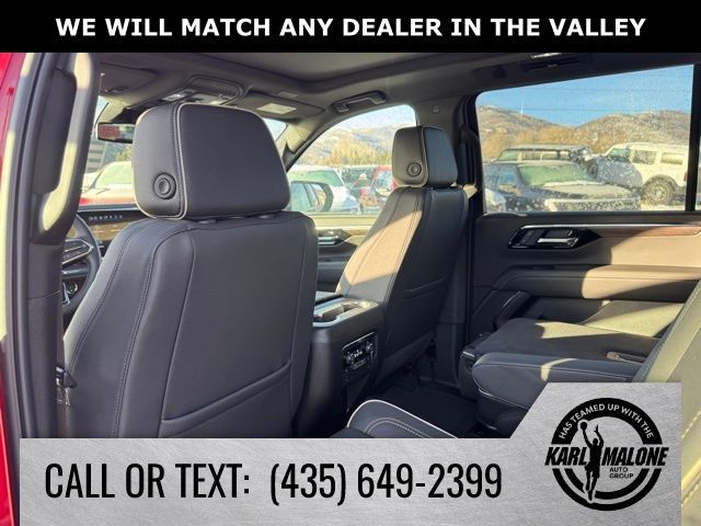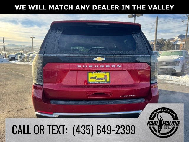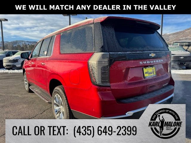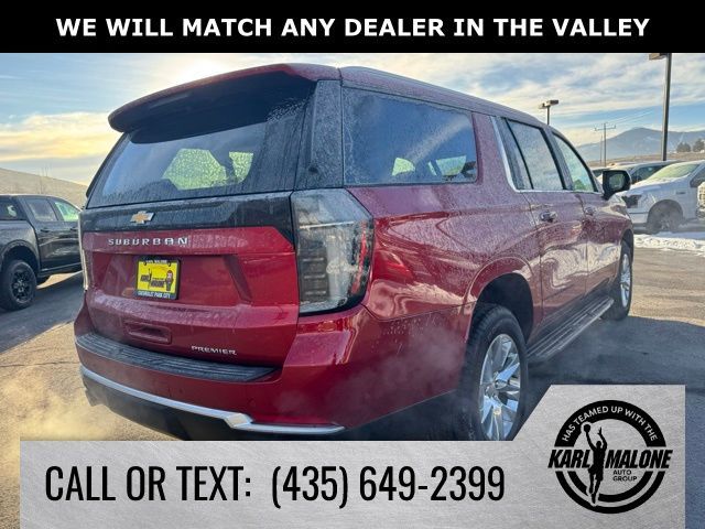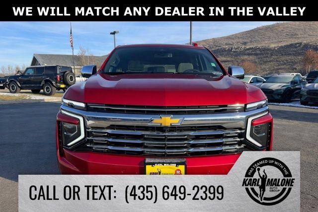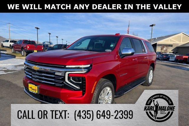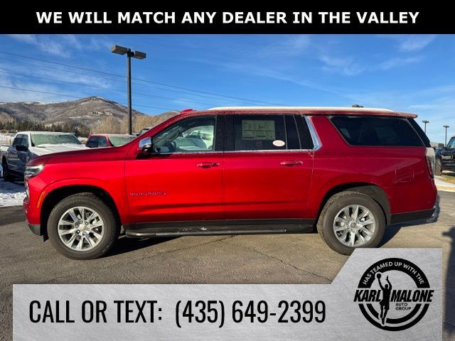 Radiant Red Tintcoat 2025 Chevrolet Suburban Premier 4WD 10-Speed Automatic with Overdrive EcoTec3 5.3L V8 10 Speakers, 2-Speed Active Electronic AutoTrac Transfer Case, 20'' x 9'' Polished Aluminum Wheels, 3.23 Rear Axle Ratio, 3rd Row 60/40 Power-Folding Split-Bench, 3rd row seats: split-bench, 4-Way Power Driver Lumbar Seat Adjuster, 4-Way Power Front Passenger Lumbar Seat Adjuster, 4-Wheel Disc Brakes, 8-Way Power Driver Seat Adjuster, 8-Way Power Front Passenger Seat Adjuster, ABS brakes, Adaptive suspension, Advanced Trailering Package, Air Conditioning, Alloy wheels, AM/FM radio: SiriusXM with 360L, Apple CarPlay/Android Auto, Auto High-beam Headlights, Auto-dimming door mirrors, Auto-Dimming Inside Rear-View Mirror, Auto-dimming Rear-View mirror, Auto-leveling suspension, Automatic temperature control, Blind Zone Steering Assist with Trailering, Bose 10-Speaker Surround with CenterPoint, Brake assist, Bright Front and Rear Door Sill Plates, Bumpers: body-color, Chrome Door Handles with Body-Color Strip, Compass, Delay-off headlights, Driver door bin, Driver vanity mirror, Dual Exhaust System, Dual front impact airbags, Dual front side impact airbags, Dual-Pane Power Panoramic Sunroof, Electronic Stability Control, Emergency communication system: OnStar Services capable, Engine Block Heater, Exterior Parking Camera Rear, Extra Capacity Cooling System, Four wheel independent suspension, Front anti-roll bar, Front Bucket Seats, Front Center Armrest, Front dual zone A/C, Front fog lights, Front LED Fog Lamps, Front reading lights, Fully automatic headlights, Garage door transmitter, Heated 2nd Row Outboard Seats, Heated door mirrors, Heated Driver and Front Passenger Seats, Heated front seats, Heated Power-Adjustable Outside Mirrors, Heated rear seats, Heated Steering Wheel, Heated steering wheel, Hill Descent Control, Hitch View with Pan/Zoom Image Adjustment, Illuminated entry, Integrated Trailer Brake Controller, LED Headlamps with LED Daytime Running Lamps, LED Tail Lamps, License Plate Front Mounting Package, Low tire pressure warning, Magnetic Ride Control Suspension, Max Trailering Package, Memory seat, Memory Settings, Navigation system: Google built-in compatibility (select service plan required, terms and limitations apply), Occupant sensing airbag, Outside temperature display, Overhead airbag, Overhead console, Panic alarm, Passenger door bin, Passenger vanity mirror, Perforated Heated and Ventilated Seats, Perforated Leather Seating Surfaces, Power door mirrors, Power driver seat, Power Liftgate, Power passenger seat, Power Release 2nd Row Bucket Seats, Power steering, Power Tilt and Telescopic Steering Column, Power windows, Power-Sliding Center Floor Console, Preferred Equipment Group 1LZ, Radio data system, Radio: 17.7'' Diagonal Advanced Color LCD Display, Rain sensing wipers, Rear air conditioning, Rear anti-roll bar, Rear Power Liftgate, Rear reading lights, Rear window defroster, Rear window wiper, Remote keyless entry, Security system, SiriusXM with 360L Trial Subscription, Smart Trailer Integration Indicator, Speed control, Speed-sensing steering, Split folding rear seat, Spoiler, Steering wheel memory, Steering wheel mounted audio controls, Sun and Tow Package, Tachometer, Telescoping steering wheel, Tilt steering wheel, Traction control, Trip computer, Turn signal indicator mirrors, Universal Home Remote, Variably intermittent wipers, Ventilated front seats, Voltmeter, Wireless Apple CarPlay/Wireless Android Auto, Wireless Phone Charging.