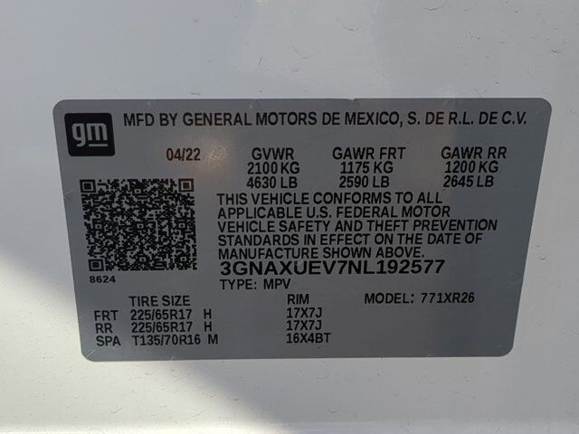 TIRES P225/65R17 ALL-SEASON BLACKWALL (STD),WHEELS 17 (43.2 CM) ALUMINUM (STD),ENGINE 1.5L TURBO DOHC 4-CYLINDER SIDI VVT (170 hp [127.0 kW] @ 5600 rpm 203 lb-ft of torque [275.0 N-m] @ 2000 - 4000 rpm) (STD),LT PREFERRED EQUIPMENT GROUP includes standard equipment,NOT EQUIPPED WITH DRIVER AND FRONT PASSENGER HEATED SEATS see dealer for details (Certain vehicles built between November 15 2021 and February 27 2022 and after March 13 2022 through May 1 2022 equipped with (ZQ2) Driver Convenience Package will be forced to include (00V) Not Equipped with Driver and Front Passenger Heated Seats which removes driver and front passenger heated seats. Vehicles equipped with (00V) Not Equipped with Driver and Front Passenger Heated Seats will be eligible for later dealer retrofit to enable functionality see dealer for details.),STEERING WHEEL LEATHER-WRAPPED 3-SPOKE,AUDIO SYSTEM CHEVROLET INFOTAINMENT 3 SYSTEM 7 DIAGONAL COLOR TOUCHSCREEN AM/FM STEREO. Additional features for compatible phones include: Bluetooth audio streaming for 2 active devices voice command pass-through to phone Apple CarPlay and Android Auto capable. (STD),FRONT AND REAR PARK ASSIST,LPO BLACK BOWTIE EMBLEMS FRONT AND REAR,LPO FRONT AND REAR SPLASH GUARDS CUSTOM MOLDED,AIR CONDITIONING DUAL-ZONE AUTOMATIC CLIMATE CONTROL with individual climate settings for driver and right-front passenger,REMOTE START,SUMMIT WHITE,SEATS FRONT BUCKET (STD),SEATS HEATED DRIVER AND FRONT PASSENGER Certain vehicles built between November 15 2021 and February 27 2022 and after March 13 2022 through May 1 2022 will be forced to include (00V) Not Equipped with Driver and Front Passenger Heated Seats which removes driver and front passenger heated seats. See dealer for details or the window label for the features on a specific vehicle. Feature will not function on certain models without later dealer retrofit see dealer for details.),CONFIDENCE & CONVENIENCE PACKAGE includes (B26) Driver Confidence II Package and (ZQ2) Driver Convenience Package content,LANE CHANGE ALERT WITH SIDE BLIND ZONE ALERT Vehicles built on or after July 4 2022 will be forced to include (00S) Not Equipped with Lane Change Alert with Side Blind Zone Alert and Rear Cross Traffic Alert which removes Lane Change Alert with Side Blind Zone Alert and Rear Cross Traffic Alert. Vehicles equipped with (00S) Not Equipped with Lane Change Alert with Side Blind Zone Alert and Rear Cross Traffic Alert will be eligible for later dealer retrofit to enable functionality. See dealer for details or the window label for the features on a specific vehicle.),TRANSMISSION 6-SPEED AUTOMATIC ELECTRONICALLY-CONTROLLED WITH OVERDRIVE includes Driver Shift Control (STD),DRIVER CONVENIENCE PACKAGE includes (BTV) Remote Start (CJ2) dual-zone automatic climate control (KA1) driver and front passenger heated seats (N34) leather-wrapped steering wheel and (TB5) power liftgate. Vehicles built prior to November 15 2021 and on or after February 28 2022 through March 13 2022 and after May 1 2022 include driver and front passenger heated seats. Certain vehicles built between November 15 2021 and February 27 2022 and after March 13 2022 through May 1 2022 will be forced to include (00V) Not Equipped with Driver and Front Passenger Heated Seats which removes driver and front passenger heated seats. Vehicles equipped with (00V) Not Equipped with Driver and Front Passenger Heated Seats will be eligible for later dealer retrofit to enable functionality see dealer for details.),REAR CROSS TRAFFIC ALERT Vehicles built on or after July 4 2022 will be forced to include (00S) Not Equipped with Lane Change Alert with Side Blind Zone Alert and Rear Cross Traffic Alert which removes Lane Change Alert with Side Blind Zone Alert and Rear Cross Traffic Alert. Vehicles equipped with (00S) Not Equipped with Lane Change Alert with Side Blind Zone Alert and Rear Cross Traffic Alert will be eligible for later dealer retrofit to enable functionality. See dealer for details or the window label for the features on a specific vehicle.),LIFTGATE REAR POWER,DRIVER CONFIDENCE II PACKAGE includes (UFG) Rear Cross Traffic Alert and (UKC) Lane Change Alert with Side Blind Zone Alert Includes (UD5) Front and Rear Park Assist. Vehicles built on or after July 4 2022 will be forced to include (00S) Not Equipped with Lane Change Alert with Side Blind Zone Alert and Rear Cross Traffic Alert which removes Lane Change Alert with Side Blind Zone Alert and Rear Cross Traffic Alert. Vehicles equipped with (00S) Not Equipped with Lane Change Alert with Side Blind Zone Alert and Rear Cross Traffic Alert will be eligible for later dealer retrofit to enable functionality. See dealer for details or the window label for the features on a specific vehicle.),AXLE 3.87 FINAL DRIVE RATIO,JET BLACK PREMIUM CLOTH SEAT TRIM,LICENSE PLATE FRONT MOUNTING PACKAGE,Lane Departure Warning,Lane Keeping Assist,Front Collision Mitigation,Front Collision Warning,Automatic Highbeams,Turbocharged,All Wheel Drive,ABS,4-Wheel Disc Brakes,Aluminum Wheels,Tires - Front All-Season,Tires - Rear All-Season,Temporary Spare Tire,Automatic Headlights,Automatic Highbeams,Privacy Glass,Heated Mirrors,Power Mirror(s),AM/FM Stereo,MP3 Capability,Bluetooth Connection,Auxiliary Audio Input,Smart Device Integration,Satellite Radio,Requires Subscription,Bluetooth Connection,WiFi Hotspot,Bluetooth Connection,Smart Device Integration,Bucket Seats,Cloth Seats,Power Driver Seat,Driver Adjustable Lumbar,Power Driver Seat,Driver Adjustable Lumbar,Pass-Through Rear Seat,Rear Bench Seat,Floor Mats,Floor Mats,Adjustable Steering Wheel,Steering Wheel Audio Controls,Power Windows,Power Windows,Power Windows,Power Door Locks,Keyless Entry,Power Door Locks,Keyless Start,Cruise Control,Security System,Security System,MP3 Capability,Auxiliary Audio Input,MP3 Capability,Auxiliary Audio Input,A/C,Rear Defrost,Power Outlet,Driver Vanity Mirror,Passenger Vanity Mirror,Driver Illuminated Vanity Mirror,Passenger Il