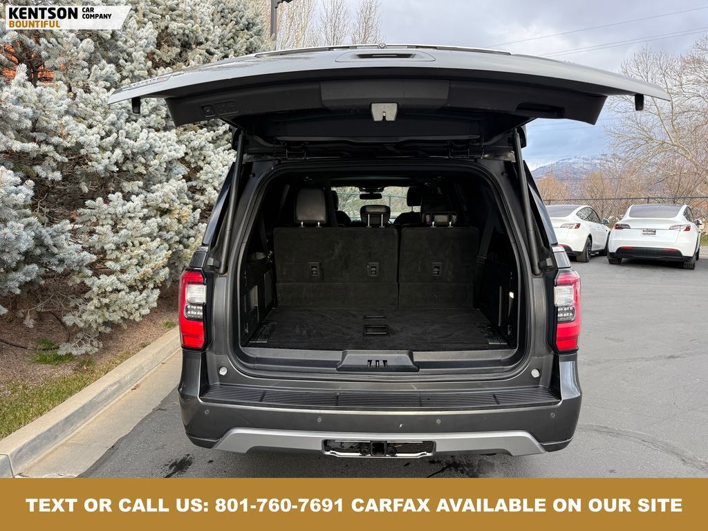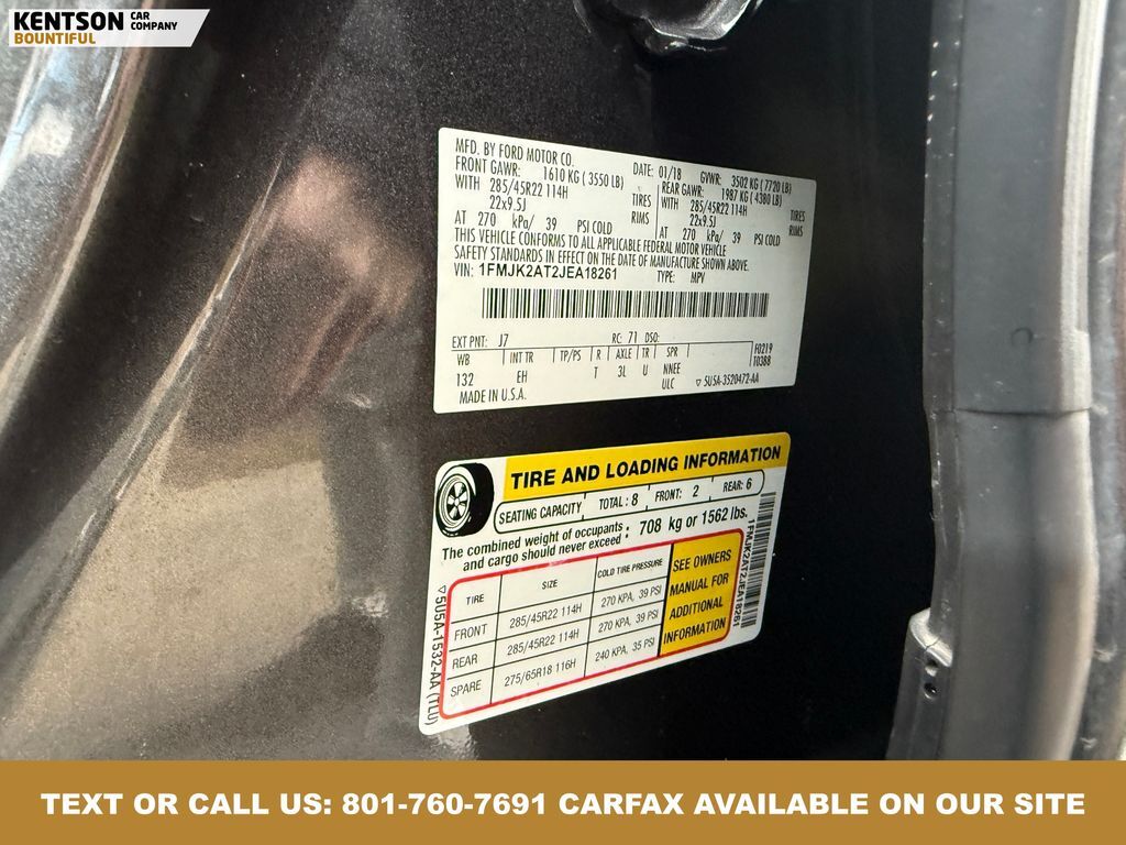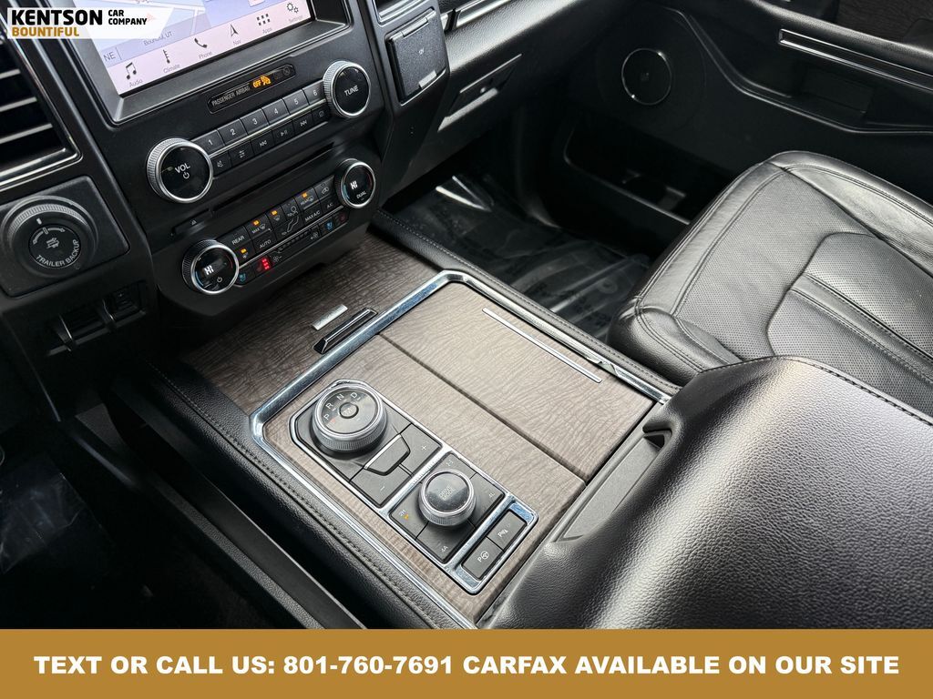Cargo Package (Black Roof Rail Crossbars), Driver Assistance Package (Adaptive Cruise Control, Automatic High Beam Headlamp, Lane-Keeping System, Pre-Collision Assist, and Rain-Sensing Front Wipers), Equipment Group 302A (22'' Polished Aluminum Wheels, 360-Degree Camera w/Split View, Enhanced Active Park Assist System, LED Headlamps & Fog Lamps, Panoramic Vista Roof, and Voice-Activated Touch-Screen Navigation System), Heavy-Duty Trailer Tow Package (Heavy-Duty Engine Radiator, Integrated Trailer Brake Controller, and Pro Trailer Backup Assist), 12 Speakers, 20'' Ultra Bright Machined Aluminum Wheels, 3rd row seats: split-bench, 4-Wheel Disc Brakes, ABS brakes, Adjustable pedals, Air Conditioning, Alloy wheels, AM/FM radio, AppLink/Apple CarPlay and Android Auto, Auto-dimming door mirrors, Auto-dimming Rear-View mirror, Automatic temperature control, Brake assist, Bumpers: body-color, CD player, Compass, Delay-off headlights, Driver door bin, Driver vanity mirror, Dual front impact airbags, Dual front side impact airbags, Electronic Stability Control, Emergency communication system: SYNC 3 911 Assist, Exterior Parking Camera Rear, Four wheel independent suspension, Front anti-roll bar, Front Bucket Seats, Front Center Armrest, Front dual zone A/C, Front fog lights, Front reading lights, Fully automatic headlights, Garage door transmitter, Heated & Cooled Leather Front Bucket Seats, Heated door mirrors, Heated front seats, Heated rear seats, Heated steering wheel, Illuminated entry, Leather steering wheel, Low tire pressure warning, Memory seat, Occupant sensing airbag, Outside temperature display, Overhead airbag, Overhead console, Panic alarm, Passenger door bin, Passenger vanity mirror, Pedal memory, Power door mirrors, Power driver seat, Power Liftgate, Power passenger seat, Power steering, Power windows, Radio data system, Radio: B&O PLAY Premium Audio System by harman, Rear air conditioning, Rear anti-roll bar, Rear audio controls, Rear reading lights, Rear window defroster, Rear window wiper, Remote keyless entry, Roof rack: rails only, Security system, SiriusXM Satellite Radio, Speed control, Speed-sensing steering, Speed-Sensitive Wipers, Split folding rear seat, Steering wheel memory, Steering wheel mounted audio controls, SYNC 3 Communications & Entertainment System, Tachometer, Telescoping steering wheel, Tilt steering wheel, Traction control, Trip computer, Turn signal indicator mirrors, Variably intermittent wipers, Ventilated front seats, and Voltmeter.
