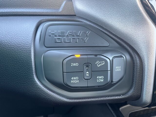 The 2024 RAM 2500 Rebel stands tall on massive 33-inch all-terrain tires wrapped around bold black diamond-cut 20-inch wheels, its aggressive stance announcing capability before you even fire the engine. Powder-coated bumpers, black exterior badging, and a sport performance hood give it a purposeful, muscular profile a truck that is ready for trailhead mornings and jobsite evenings alike.