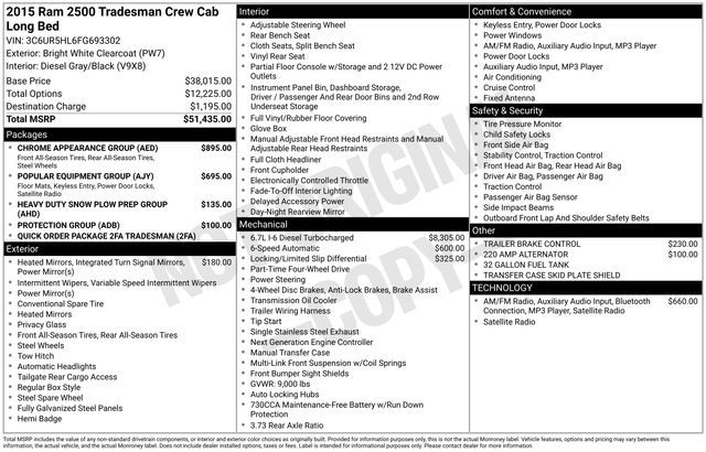 Turn every drive into something special with this Ram 2500 from Salt Lake Valley Chevrolet! Designed for comfort, performance, and style, this vehicle comes fully equipped with modern technology and convenience features you’ll love. Price excludes tax, title, license fee, government fees, and $449 dealer documentary service fee. While every reasonable effort is made to ensure accuracy, we are not responsible for errors or omissions, and vehicles may be sold prior to inquiry—please contact the dealer to confirm availability. All financing is subject to approved credit. If you’re shopping for used cars in Salt Lake City, or searching for the perfect SUV, truck, or sedan, this Ram 2500 delivers the dependability and value you’re looking for. It’s the ideal match for your lifestyle - ready for everything from mountain adventures to city commutes. Visit Salt Lake Valley Chevrolet today and see why so many Utah drivers trust us for great deals on quality pre-owned vehicles. Explore our inventory online at www.slvchevy.com or call 801-969-8221 to schedule your test drive today! This impressive vehicle includes Chrome Appearance Group (Bright Front Bumper, Bright Grille, Bright Rear Bumper, and Wheels: 18'' x 8.0'' Steel Chrome Clad), Heavy Duty Snow Plow Prep Group, Popular Equipment Group (1-Yr SiriusXM Radio Service, 40/20/40 Split Bench Seat, Carpet Floor Covering, Cloth 40/20/40 Bench Seat, For More Info, Call 800-643-2112, Front & Rear Floor Mats, Rear Folding Seat, Remote Keyless Entry, and SiriusXM Satellite Radio), Protection Group, Quick Order Package 2FA Tradesman, 17'' x 7.5'' Steel Styled Wheels, 220 Amp Alternator, 32 Gallon Fuel Tank, 4-Wheel Disc Brakes, 5.0'' Touchscreen Display, 6 Speakers, ABS brakes, Air Conditioning, AM/FM radio, Anti-Spin Differential Rear Axle, Black Exterior Mirrors, Brake assist, Center Hub, Charge Only Remote USB Port, Continental Radio Manufacturer, Delay-off headlights, Driver door bin, Dual front impact airbags, Dual front side impact airbags, Electronic Stability Control, Electronically Controlled Throttle, Exterior Mirrors Courtesy Lamps, Exterior Mirrors w/Heating Element, Exterior Mirrors w/Supplemental Signals, Front anti-roll bar, Front Bumper Sight Shields, Front Center Armrest, Fully automatic headlights, GPS Antenna Input, Heated door mirrors, Heavy Duty Vinyl 40/20/40 Split Bench Seat, Hemi Badge, Integrated Voice Command w/Bluetooth, Low tire pressure warning, Media Hub (USB, AUX), Next Generation Engine Controller, Occupant sensing airbag, Overhead airbag, Overhead Console, Passenger door bin, Power Black Trailer Tow Mirrors, Power door mirrors, Power steering, Power windows, Radio data system, Radio: Uconnect 3.0 AM/FM, Radio: Uconnect 5.0 AM/FM/BT, Rear seat center armrest, Rear step bumper, Rear View Mirror w/Microphone, Speed control, Tachometer, Temperature & Compass Gauge, Tilt steering wheel, Tip Start, Traction control, Trailer Brake Control, Trailer Tow Mirrors, Transmission Oil Cooler, Variably intermittent wipers, and Voltmeter, offering everything you need for your next adventure.