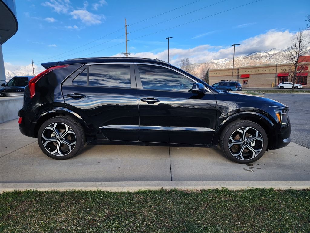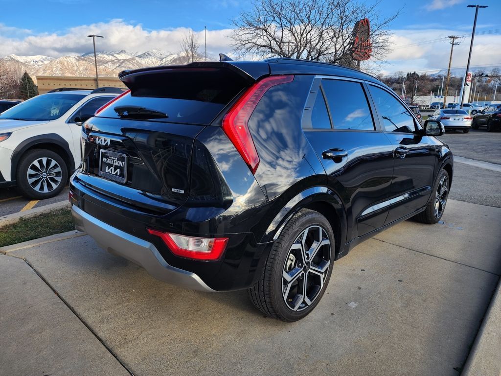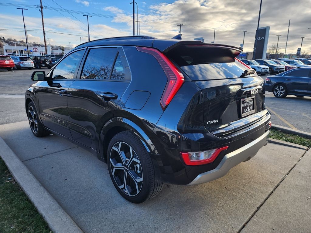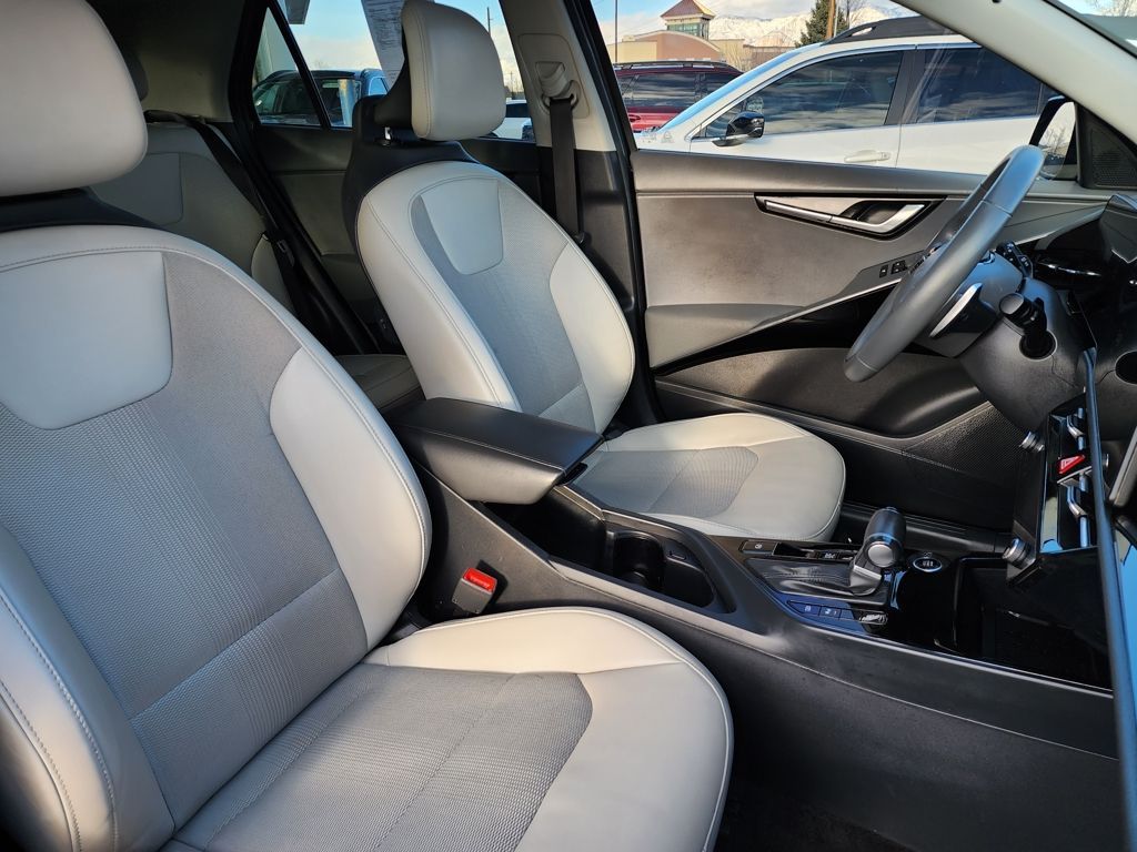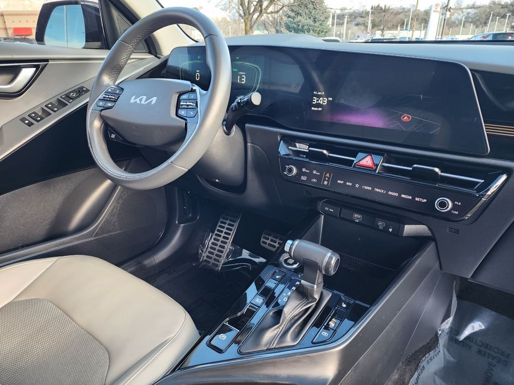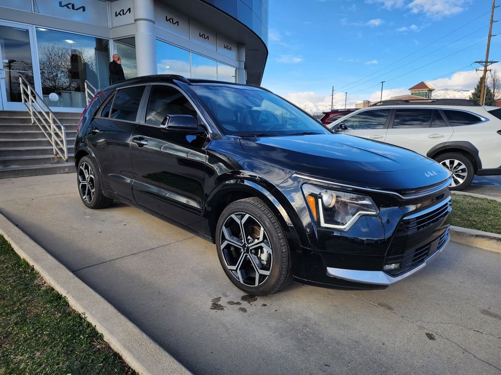 Aurora Black Pearl 2023 Kia Niro EX Touring FWD 6-Speed Automatic 1.6L I4 DGI Hybrid DOHC 16V LEV3-SULEV30 1.6L I4 DGI Hybrid DOHC 16V LEV3-SULEV30, 4-Wheel Disc Brakes, 4.438 Axle Ratio, 6 Speakers, ABS brakes, Air Conditioning, Alloy wheels, AM/FM radio: SiriusXM, Apple CarPlay & Android Auto, Auto High-beam Headlights, Automatic temperature control, Brake assist, Bumpers: body-color, Carpet Floor Mats, Cloth & Vegan Leather-Trimmed Seats, Delay-off headlights, Driver door bin, Driver vanity mirror, Dual front impact airbags, Dual front side impact airbags, Electronic Stability Control, Emergency communication system: Kia Connect (includes 1 year free trial), Exterior Parking Camera Rear, Four wheel independent suspension, Front anti-roll bar, Front Bucket Seats, Front Center Armrest, Front dual zone A/C, Front fog lights, Front reading lights, Fully automatic headlights, Heated door mirrors, Heated Front Bucket Seats, Heated front seats, Illuminated entry, Knee airbag, Leather Shift Knob, Light Gray Interior Color Package, Low tire pressure warning, Navigation System, Occupant sensing airbag, Outside temperature display, Overhead airbag, Overhead console, Panic alarm, Passenger door bin, Passenger vanity mirror, Power door mirrors, Power driver seat, Power moonroof, Power steering, Power windows, Radio: AM/FM/HD/SiriusXM, Rain sensing wipers, Rear anti-roll bar, Rear seat center armrest, Rear window defroster, Rear window wiper, Remote keyless entry, Security system, Smart Key w/ Push Button and Remote Start, Speed control, Speed-sensing steering, Split folding rear seat, Spoiler, Steering wheel mounted audio controls, Telescoping steering wheel, Tilt steering wheel, Traction control, Trip computer, Turn signal indicator mirrors, Variably intermittent wipers, Wheels: 18'' Alloy w/Machined Finish, 1.6L I4 DGI Hybrid DOHC 16V LEV3-SULEV30.