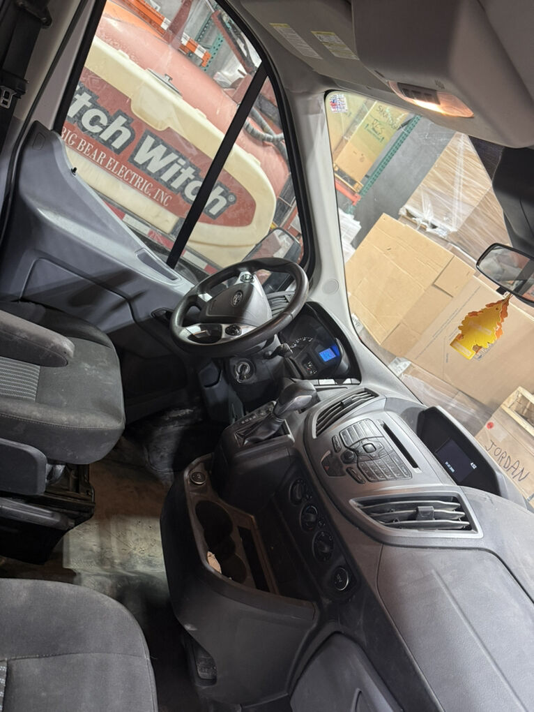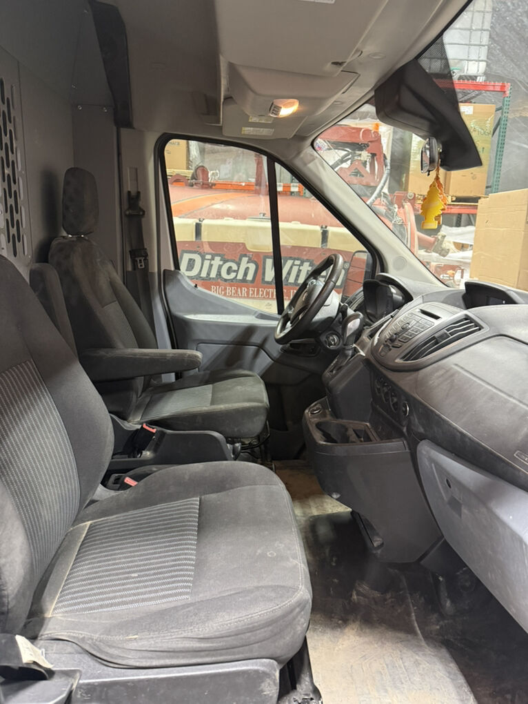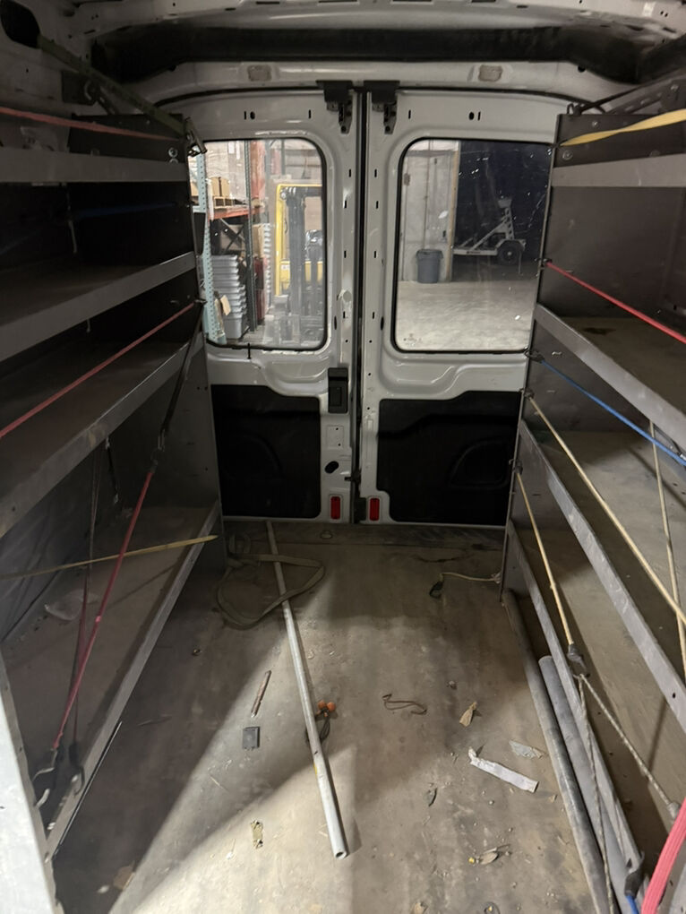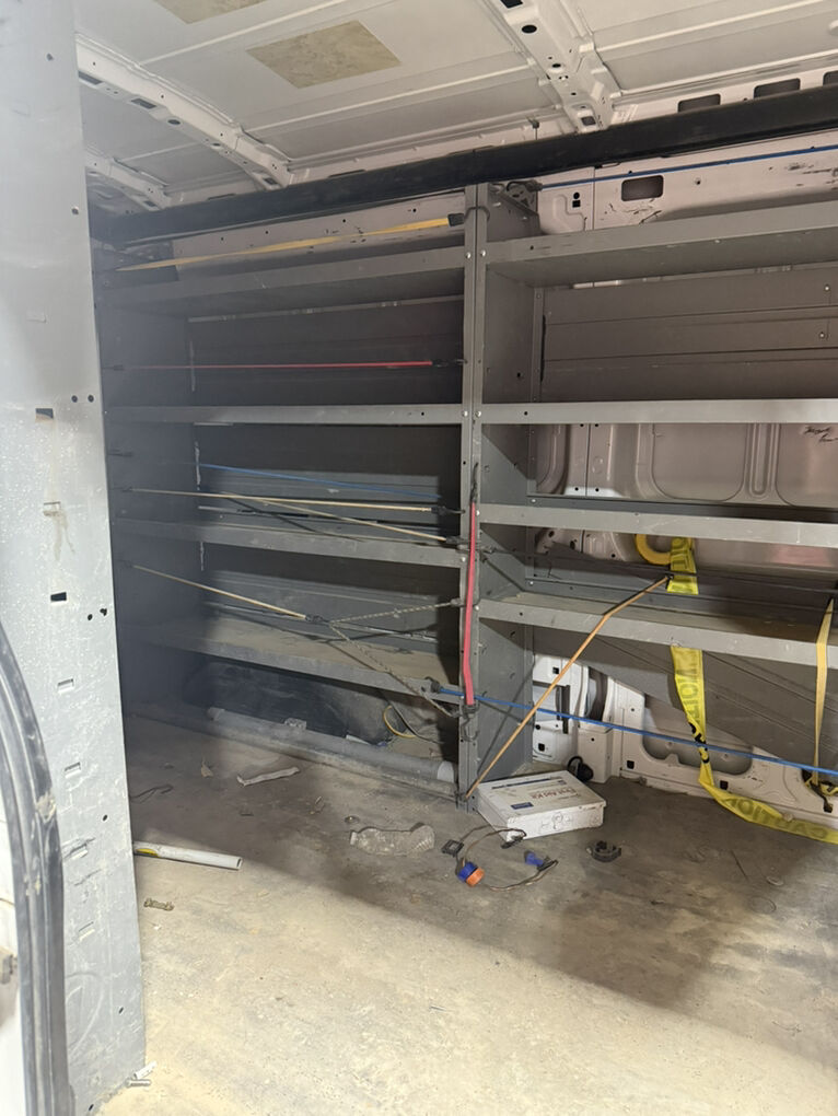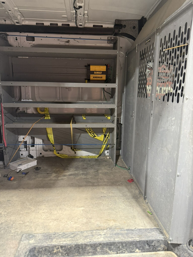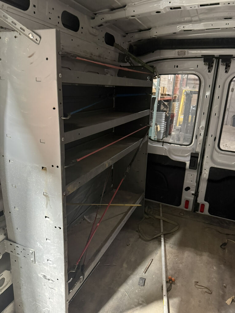 Work bins and headache racks are installed inside van.
