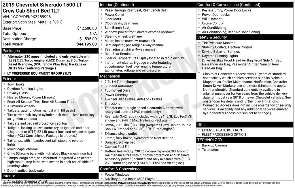 Satin Steel Metallic 2019 Chevrolet Silverado 1500 LT 4WD 8-Speed Automatic 2.7L Turbo 8-Speed Automatic, 4WD, Gideon/Very Dark Atmosphere Cloth.