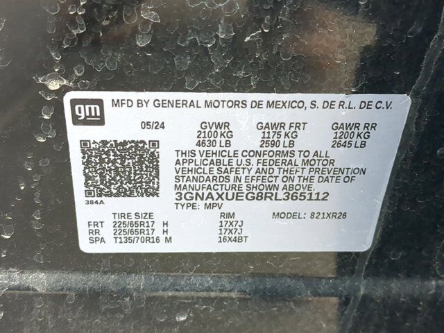 TIRES P225/65R17 ALL-SEASON BLACKWALL (STD),WHEELS 17 (43.2 CM) ALUMINUM (STD),LT PREFERRED EQUIPMENT GROUP includes standard equipment,AUDIO SYSTEM CHEVROLET INFOTAINMENT 3 SYSTEM 7 DIAGONAL COLOR TOUCHSCREEN AM/FM STEREO. Additional features for compatible phones include: Bluetooth audio streaming for 2 active devices voice command pass-through to phone Apple CarPlay and Android Auto capable. (STD),DELETED 3 YEARS OF ONSTAR REMOTE ACCESS,MOSAIC BLACK METALLIC,SEATS FRONT BUCKET (STD),TRANSMISSION 6-SPEED AUTOMATIC ELECTRONICALLY-CONTROLLED WITH OVERDRIVE includes Driver Shift Control (STD),ENGINE 1.5L TURBO DOHC 4-CYLINDER SIDI VVT (STD),AXLE 3.87 FINAL DRIVE RATIO,JET BLACK PREMIUM CLOTH SEAT TRIM,LICENSE PLATE FRONT MOUNTING PACKAGE,Climate Control,Multi-Zone A/C,A/C,Heated Front Seat(s),Remote Trunk Release,Remote Engine Start,Power Liftgate,Rear Parking Aid,Blind Spot Monitor,Cross-Traffic Alert,Lane Departure Warning,Lane Keeping Assist,Front Collision Mitigation,Front Collision Warning,Automatic Highbeams,Turbocharged,All Wheel Drive,ABS,4-Wheel Disc Brakes,Aluminum Wheels,Tires - Front All-Season,Tires - Rear All-Season,Temporary Spare Tire,Automatic Headlights,Automatic Highbeams,Privacy Glass,Heated Mirrors,Power Mirror(s),Remote Trunk Release,Power Liftgate,AM/FM Stereo,MP3 Capability,Bluetooth Connection,Auxiliary Audio Input,Smart Device Integration,Satellite Radio,Requires Subscription,Bluetooth Connection,WiFi Hotspot,Bluetooth Connection,Smart Device Integration,Bucket Seats,Cloth Seats,Heated Front Seat(s),Power Driver Seat,Driver Adjustable Lumbar,Power Driver Seat,Driver Adjustable Lumbar,Pass-Through Rear Seat,Rear Bench Seat,Floor Mats,Floor Mats,Adjustable Steering Wheel,Steering Wheel Audio Controls,Power Windows,Power Windows,Power Windows,Power Door Locks,Keyless Entry,Power Door Locks,Remote Engine Start,Keyless Start,Cruise Control,Security System,Security System,MP3 Capability,Auxiliary Audio Input,MP3 Capability,Auxiliary Audio Input,Climate Control,Multi-Zone A/C,A/C,Rear Defrost,Power Outlet,Driver Vanity Mirror,Passenger Vanity Mirror,Driver Illuminated Vanity Mirror,Passenger Illuminated Visor Mirror,Front Collision Mitigation,Front Collision Warning,Traction Control,Stability Control,Daytime Running Lights,Driver Air Bag,Passenger Air Bag,Front Side Air Bag,Front Head Air Bag,Rear Head Air Bag,Passenger Air Bag Sensor,Requires Subscription,Rear Parking Aid,Back-Up Camera,Blind Spot Monitor,Front Collision Warning,Front Collision Mitigation,Cross-Traffic Alert,Lane Departure Warning,Lane Keeping Assist,Child Safety Locks,Driver Restriction Features,Tire Pressure Monitor