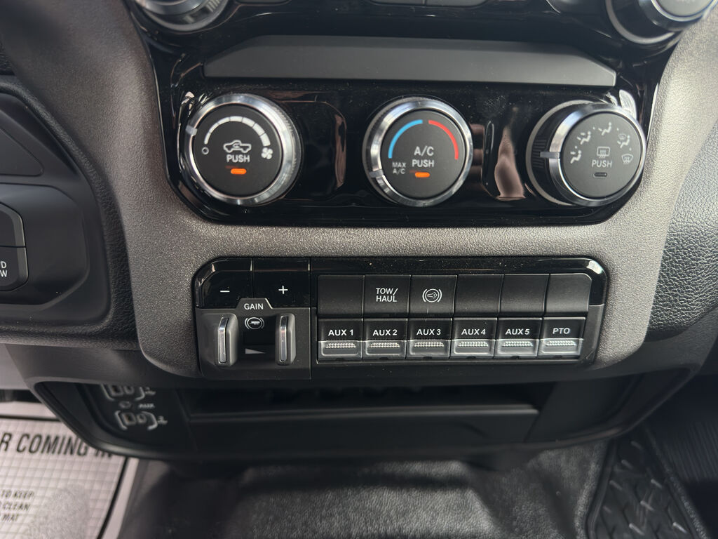 Cold Weather Group: Engine Block Heater; MOPAR Winter Front Grille Cover,Chrome Appearance Group: Chrome Grille Surround; Matte Black Mesh with Chrome Grille; Center Hub; 19.5" X 6.0" Steel Wheels; Bright Front Bumper,Tradesman Level 1 Equipment Group: Rear Window Defroster; Black Power Heated Fold Telescope Mirrors; Exterior Mirrors with Supplemental Signals; Exterior Mirrors Courtesy Lamps; Manual Folding Exterior Mirrors; Trailer Light Check; Exterior Mirrors with Heating Element; Trailer Brake Control; Mirror Running Lights; Manuarl Telescoping Mirrors; Power Adjust Mirrors; Black Exterior Mirrors; Power-Adjustable Convex Aux Mirrors,Quick Order Package 25A Tradesman,Full Size Spare Tire,Cloth 40/20/40 Bench Seat,Forward Collision Warning-Plus,Uconnect w/Bluetooth handsfree wireless device connectivity,Apple CarPlay/Android Auto smart device wireless mirroring,Cloth front seat upholstery,Driver seat with 4-way directional controls,Front passenger seat with 4-way directional controls,8.4 inch primary display,Pedestrian/Cyclist Emergency Braking,4G LTE Wi-Fi Hot Spot mobile hotspot internet access,Adaptive cruise control with stop and go,Cruise control with steering wheel mounted controls,Primary monitor touchscreen,19.5 x 6-inch front and dual rear silver steel wheels,Part-time 4WD,Cummins 6.7L I-6 diesel direct injection, VVT intercooled turbo, diesel, engine with 360HP,Bluetooth wireless audio streaming,Following distance alert,Smart key with push button start,Trailer light test,Sentry Key immobilizer,RAM Connect vehicle tracker,RAM Connect vehicle integrated emergency SOS system,Trailer brake controller,Trailer sway control,External memory control,Internet radio capability,5 USB ports,Electronic stability control system,Rear Seat Reminder Alert rear seat check warning,LED front fog lights,Active grille shutters,Manual rear child safety door locks,RAM Connect App mobile app access,Illuminated front beverage holders,Heated driver and passenger side door mirrors,Gage cluster display size: 3.50,Manual tilting steering wheel,Wheel hub covers,Manual extendable trailer mirrors,Exterior mirror LED spot lights,Upfitter switches,Dual rear wheels,Over the air updates,Metric measure truck 225/70R19.5 AS BSW 651 RPM front and rear tires,2 airbags,Driver front impact airbag,Passenger front impact airbag,Airbag occupancy sensor,Auto-locking doors,Valet key