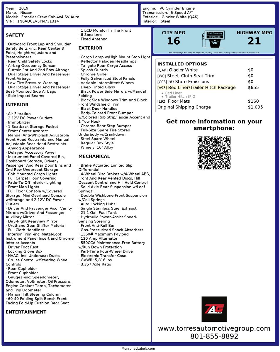 The 2019 Nissan Frontier Crew Cab 4x4 SV Auto Ltd Avail embodies robust capability and modern styling- making it a versatile choice for both city commutes and off-road adventures. The exterior- painted in a crisp Glacier White- gives the truck a clean and sophisticated look- while its bold front grille and sleek Midnight Edition accents add a touch of refinement. The Crew Cab design provides ample room for passengers- ensuring a comfortable ride no matter where your journey takes you.