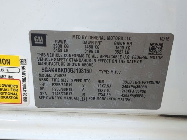 Preferred Equipment Group 1SL,6 Speakers,AM/FM radio: SiriusXM,CD player,Radio data system,Radio: Color Touch AM/FM/CD w/IntelliLink,SiriusXM Satellite Radio,Air Conditioning,Automatic temperature control,Front dual zone A/C,Rear air conditioning,Rear window defroster,Memory seat,Power driver seat,Power steering,Power windows,Remote keyless entry,Steering wheel mounted audio controls,Four wheel independent suspension,Speed-sensing steering,Traction control,4-Wheel Disc Brakes,ABS brakes,Dual front impact airbags,Dual front side impact airbags,Emergency communication system: OnStar Guidance,Front anti-roll bar,Low tire pressure warning,Occupant sensing airbag,Overhead airbag,Rear anti-roll bar,Power Liftgate,Brake assist,Electronic Stability Control,Exterior Parking Camera Rear,Rear Parking Sensors,Delay-off headlights,Fully automatic headlights,High intensity discharge headlights: Bi-Xenon,Panic alarm,Security system,Speed control,Black Roof Rack Cross Rails,Bumpers: body-color,Front License Plate Mounting Bracket,Heated door mirrors,Power door mirrors,Roof rack: rails only,Spoiler,Turn signal indicator mirrors,Auto-dimming Rear-View mirror,Compass,Driver door bin,Driver vanity mirror,Front reading lights,Garage door transmitter,Heated steering wheel,Illuminated entry,Leather steering wheel,Outside temperature display,Passenger vanity mirror,Rear reading lights,Tachometer,Telescoping steering wheel,Tilt steering wheel,Trip computer,Voltmeter,3rd row seats: split-bench,7-Passenger Seating,Front Bucket Seats,Heated front seats,Perforated Leather-Appointed Seat Trim,Power passenger seat,Front Center Armrest w/Storage,Passenger door bin,Alloy wheels,Wheels: 19 inch 10-Spoke Aluminum,Rear window wiper,Variably intermittent wipers,3.16 Axle Ratio,LICENSE PLATE BRACKET FRONT MOUNTING PACKAGE,SUMMIT WHITE,TRANSMISSION 6- SPEED AUTOMATIC ELECTRONICALLY CONTROLLED WITH OVERDRIVE (STD),1SL PREFERRED EQUIPMENT GROUP Includes Standard Equipment,SEATING 7-PASSENGER FRONT BUCKET second-row captain's chairs flat folding and SmartSlide access to third row third row flat folding 60/40 split bench (STD),LIGHT TITANIUM PERFORATED LEATHER SEATING SURFACE with Dark Titanium interior accents,ENGINE 3.6L VARIABLE VALVE TIMING V6 WITH SIDI (SPARK IGNITION DIRECT INJECTION) DOHC (288 hp [214.7 kW] @ 6300 rpm 270 lb-ft of torque [364.5 N-m] @ 3400 rpm) (STD),AUDIO SYSTEM COLOR TOUCH RADIO WITH INTELLILINK AM/FM/SIRIUSXM RADIO WITH CD PLAYER 6.5 diagonal touch-screen display USB port and auxiliary input jack (STD),LPO BLACK ROOF RACK CROSS RAILS,WHEELS 19 (48.3 CM) 10-SPOKE ALUMINUM (STD),TIRES P255/60R19-108S ALL-SEASON BLACKWALL MICHELIN (STD),All Wheel Drive,Power Steering,Aluminum Wheels,Tires - Front All-Season,Tires - Rear All-Season,Temporary Spare Tire,HID headlights,Automatic Headlights,Privacy Glass,Heated Mirrors,Power Mirror(s),Integrated Turn Signal Mirrors,Mirror Memory,Intermittent Wipers,Intermittent Wipers,Remote Trunk Release,Power Liftgate,AM/FM Stereo,CD Player,Satellite Radio,MP3 Capability,Bluetooth Connection,Auxiliary Audio Input,Requires Subscription,MP3 Capability,Bluetooth Connection,Auxiliary Audio Input,MP3 Capability,Auxiliary Audio Input,MP3 Capability,Auxiliary Audio Input,Satellite Radio,Requires Subscription,3rd Row Seat,Bucket Seats,Rear Bucket Seats,Heated Front Seat(s),Power Driver Seat,Driver Adjustable Lumbar,Seat Memory,Power Passenger Seat,Passenger Adjustable Lumbar,Power Driver Seat,Mirror Memory,Seat Memory,Floor Mats,Adjustable Steering Wheel,Leather Steering Wheel,Cruise Control,Steering Wheel Audio Controls,Heated Steering Wheel,Power Windows,Power Door Locks,Universal Garage Door Opener,Cruise Control,Keyless Entry,Power Door Locks,Remote Engine Start,Security System,Immobilizer,Climate Control,Multi-Zone A/C,A/C,Rear A/C,Rear Defrost,Auto-Dimming Rearview Mirror,Driver Vanity Mirror,Passenger Vanity Mirror,Driver Illuminated Vanity Mirror,Passenger Illuminated Visor Mirror,ABS,4-Wheel Disc Brakes,Traction Control,Traction Control,Stability Control,Daytime Running Lights,Automatic Headlights,Driver Air Bag,Passenger Air Bag,Front Side Air Bag,Front Head Air Bag,Rear Head Air Bag,Passenger Air Bag Sensor,Passenger Air Bag Sensor,Telematics,Navigation from Telematics,Requires Subscription,Telematics,WiFi Hotspot,Requires Subscription,Blind Spot Monitor,Cross-Traffic Alert,Rear Parking Aid,MP3 Capability,Bluetooth Connection,Back-Up Camera,Auxiliary Audio Input,Child Safety Locks,Tire Pressure Monitor