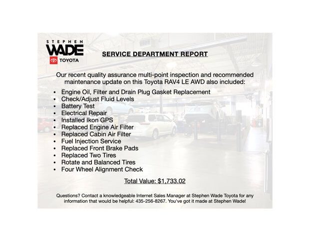 ONE OWNER CLEAN CARFAX. 2024 Toyota RAV4 LE AWD in Silver Sky Metallic with Black Fabric. 2.5L 4-Cylinder Engine w/Start-Stop, 8-Speed Automatic Transmission, All-Wheel Drive w/Multi-Terrain Select.27/34 City/Highway MPG.CALL STEPHEN WADE TOYOTA: 435-241-3828.SERVICE REPORT: At Stephen Wade Toyota, we do more to insure we offer the most mechanically sound pre-owned vehicles with maintenance that is up to date. Our recent quality assurance multi-point inspection and recommended maintenance update on this RAV4 LE AWD also included an engine oil, filter and drain plug gasket replacement, check/adjust fluid levels, battery test, electrical repair, installed Ikon GPS, replaced engine air filter, replaced cabin air filter, fuel injection service, replaced front brake pads, replaced two tires, rotate and balanced tires and a four wheel alignment check - a $1,733.02 value.MARKET REPORT: We use advanced software to shop the automotive marketplace nationwide everyday. This allows us to competitively offer you the best value one can find anywhere. Contact our knowledgeable Internet sales managers; Danny, Jessica or Wesley at Stephen Wade Toyota for a priority test drive, or for any information that would be helpful: 435-241-3828. You've got it made at Stephen Wade!