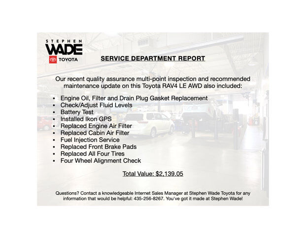 ONE OWNER CLEAN CARFAX. 2024 Toyota RAV4 LE AWD in Magnetic Gray Metallic with Black Fabric. 2.5L 4-Cylinder Engine w/Start-Stop, 8-Speed Automatic Transmission, All-Wheel Drive w/Multi-Terrain Select.27/34 City/Highway MPG.CALL STEPHEN WADE TOYOTA: 435-241-3828.SERVICE REPORT: At Stephen Wade Toyota, we do more to insure we offer the most mechanically sound pre-owned vehicles with maintenance that is up to date. Our recent quality assurance multi-point inspection and recommended maintenance update on this RAV4 LE AWD also included an engine oil, filter and drain plug gasket replacement, check/adjust fluid levels, battery test, installed Ikon GPS, replaced engine air filter, replaced cabin air filter, fuel injection service, replaced front brake pads, replaced all four tires and a four wheel alignment check - a $2,139.05 value.MARKET REPORT: We use advanced software to shop the automotive marketplace nationwide everyday. This allows us to competitively offer you the best value one can find anywhere. Contact our knowledgeable Internet sales managers; Danny, Jessica or Wesley at Stephen Wade Toyota for a priority test drive, or for any information that would be helpful: 435-241-3828. You've got it made at Stephen Wade!