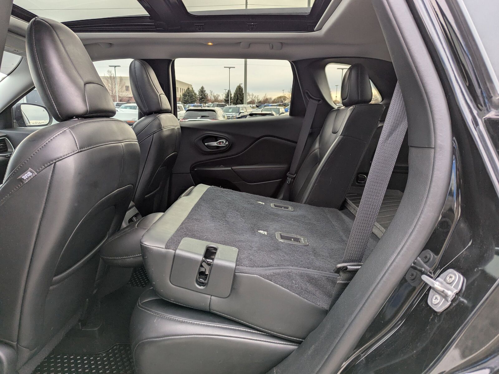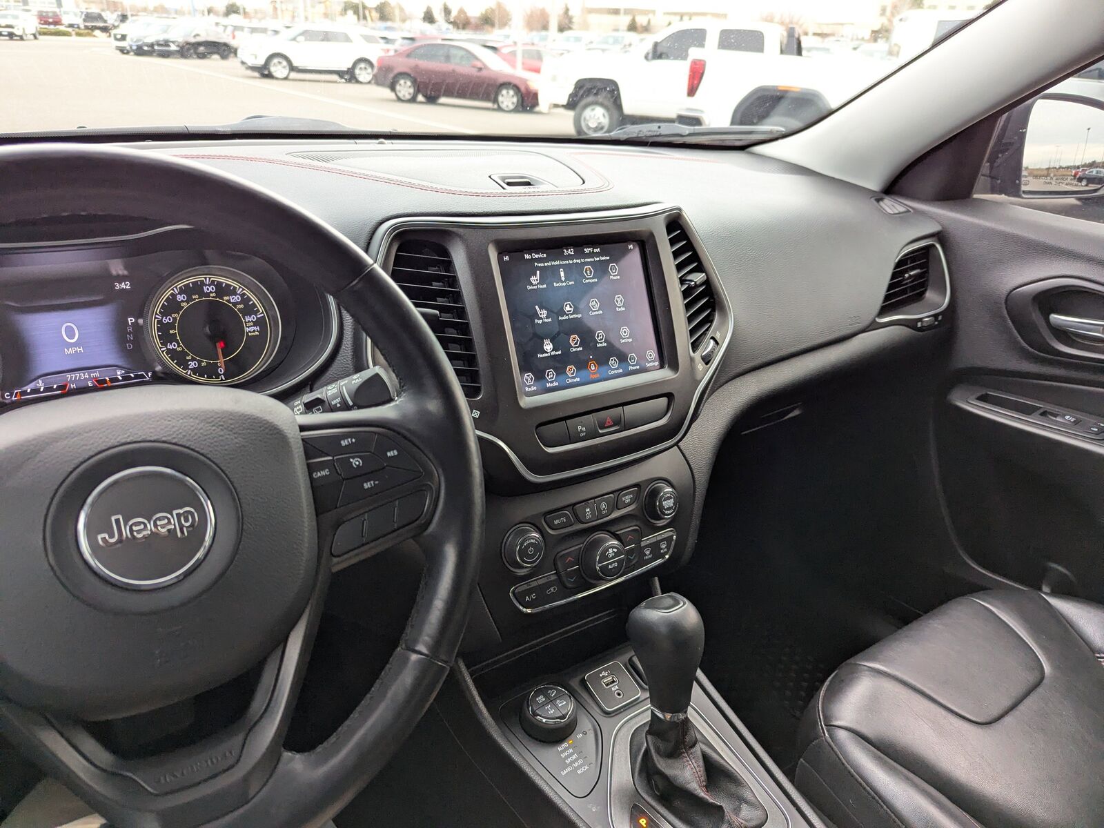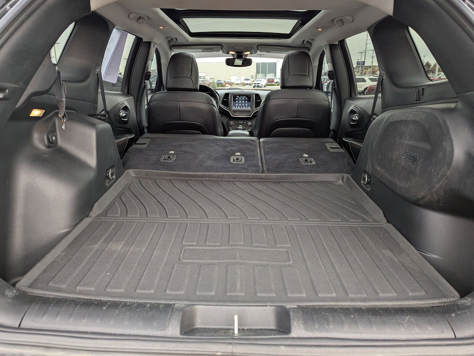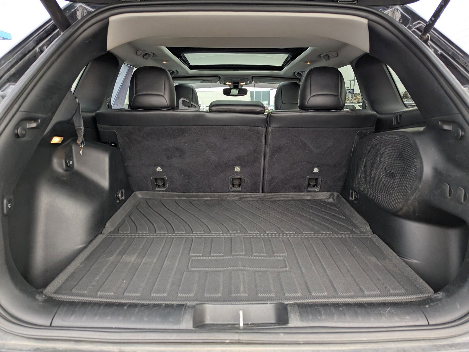 PREMIUM ALPINE SPEAKER SYSTEM,3.517 AXLE RATIO (STD),ENGINE BLOCK HEATER,QUICK ORDER PACKAGE 27E TRAILHAWK -inc: Engine: 3.2L V6 24V VVT w/ESS Transmission: 9-Speed 948TE Auto w/Active Drive II,DIAMOND BLACK CRYSTAL PEARLCOAT,POWER FRONT/FIXED REAR FULL SUNROOF,COLD WEATHER GROUP -inc: Engine Block Heater Leather Wrapped Steering Wheel Windshield Wiper De-Icer Heated Front Seats Heated Steering Wheel,BLACK CLOTH/PREMIUM VINYL BUCKET SEATS,TRANSMISSION: 9-SPEED 948TE AUTO W/ACTIVE DRIVE II (STD),COMFORT/CONVENIENCE GROUP -inc: Remote Start System Power Liftgate Security Alarm Universal Garage Door Opener Rear View Auto Dim Mirror,ENGINE: 3.2L V6 24V VVT W/ESS (STD),TRAILER TOW GROUP -inc: 7 & 4 Pin Wiring Harness Class III Receiver Hitch Trailer Tow Wiring Harness,Four Wheel Drive,Locking/Limited Slip Differential,Power Steering,ABS,4-Wheel Disc Brakes,Brake Assist,Aluminum Wheels,Tires - Front All-Terrain,Tires - Rear All-Terrain,Conventional Spare Tire,Tow Hooks,Tow Hooks,Heated Mirrors,Power Mirror(s),Integrated Turn Signal Mirrors,Rear Defrost,Privacy Glass,Intermittent Wipers,Variable Speed Intermittent Wipers,Rear Spoiler,Power Door Locks,Daytime Running Lights,Automatic Headlights,LED Headlights,Fog Lamps,AM/FM Stereo,Satellite Radio,Bluetooth Connection,Requires Subscription,MP3 Capability,Steering Wheel Audio Controls,Auxiliary Audio Input,Satellite Radio,Requires Subscription,Bluetooth Connection,Power Driver Seat,Driver Adjustable Lumbar,Power Driver Seat,Driver Adjustable Lumbar,Pass-Through Rear Seat,Rear Bench Seat,Adjustable Steering Wheel,Trip Computer,Power Windows,Keyless Entry,Power Door Locks,Keyless Entry,Power Door Locks,Keyless Start,Cruise Control,Climate Control,Multi-Zone A/C,A/C,Cloth Seats,Vinyl Seats,Bucket Seats,Driver Vanity Mirror,Passenger Vanity Mirror,Driver Illuminated Vanity Mirror,Passenger Illuminated Visor Mirror,Floor Mats,Smart Device Integration,Smart Device Integration,Power Door Locks,Power Windows,Trip Computer,Immobilizer,Traction Control,Stability Control,Traction Control,Front Side Air Bag,Rear Parking Aid,Blind Spot Monitor,Cross-Traffic Alert,Rear Collision Mitigation,Tire Pressure Monitor,Driver Air Bag,Passenger Air Bag,Front Head Air Bag,Rear Head Air Bag,Passenger Air Bag Sensor,Front Side Air Bag,Rear Side Air Bag,Knee Air Bag,Child Safety Locks,Back-Up Camera