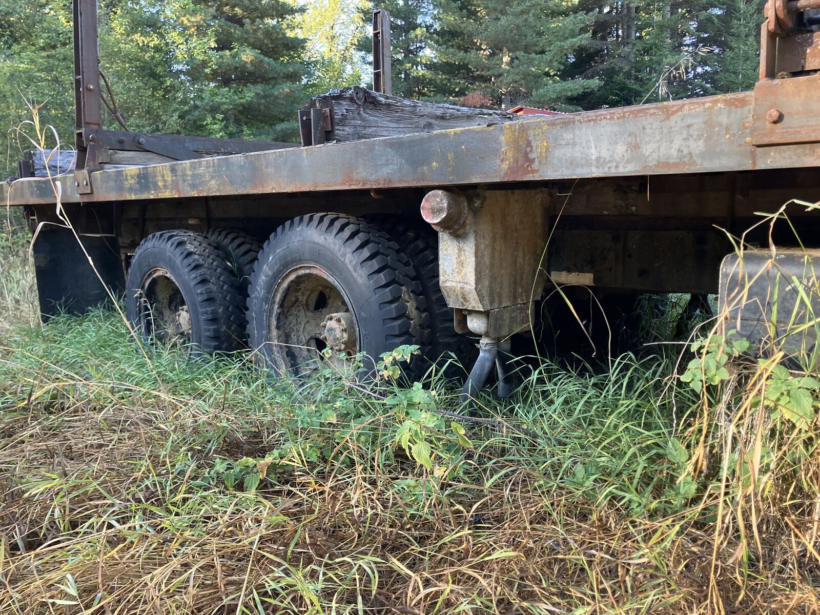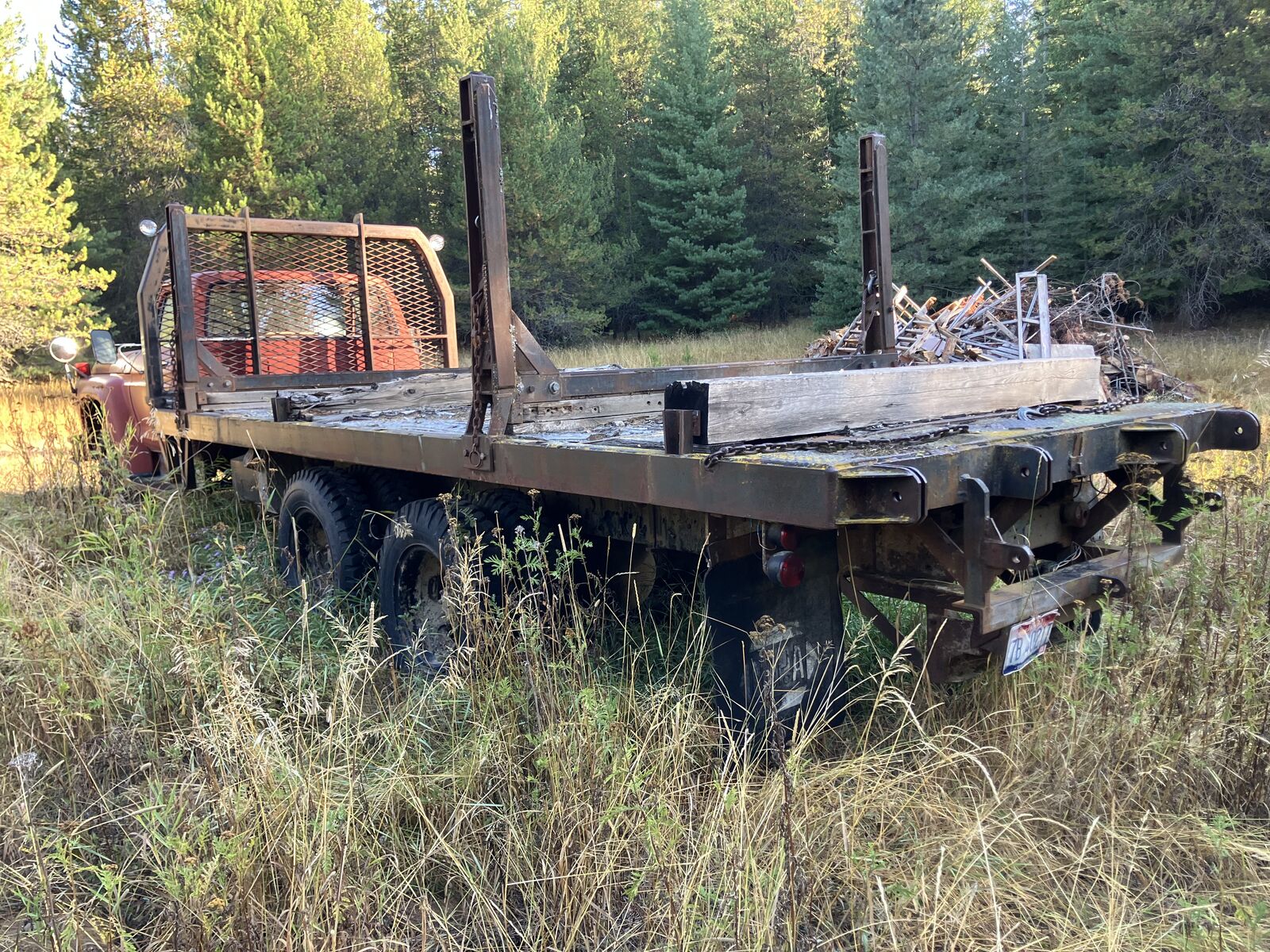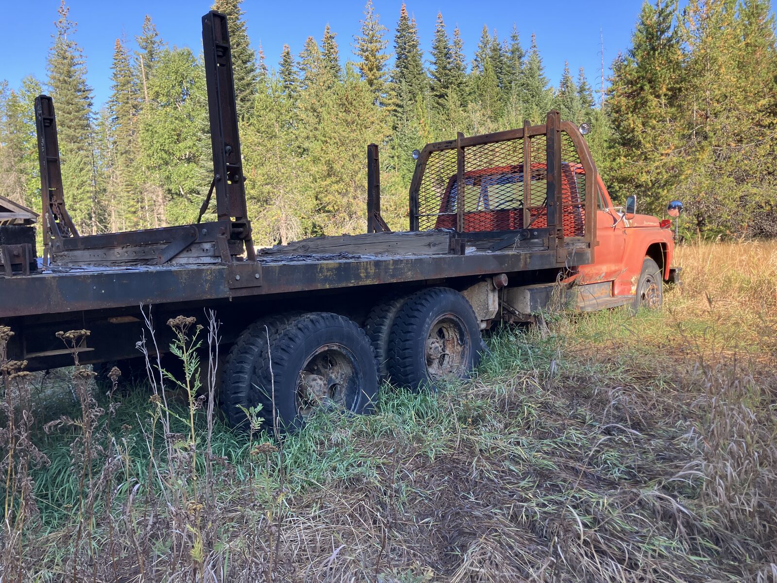 Ford Custom built 6 wheeled/dual axle logging truck. Ford 390 motor. Has air brakes & locking rear differential. 20’ deck and 30’ total length.
