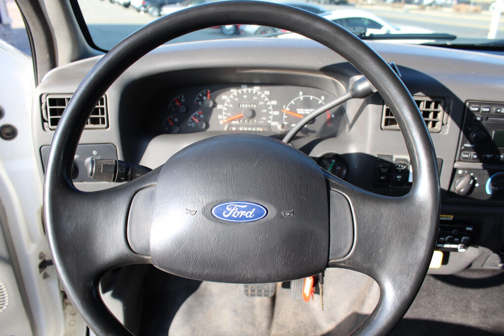 Safety and mechanical highlights include dual electric horns, emergency flashers, dual Motorcraft batteries, heavy-duty alternator, hydraulic braking system with driveline-mounted parking brake, and SAE blade-type fuses.