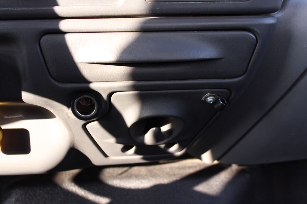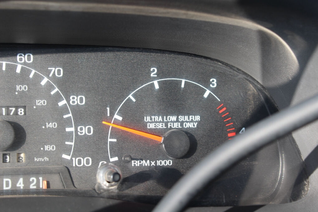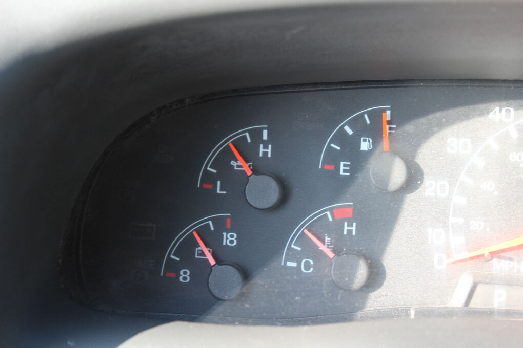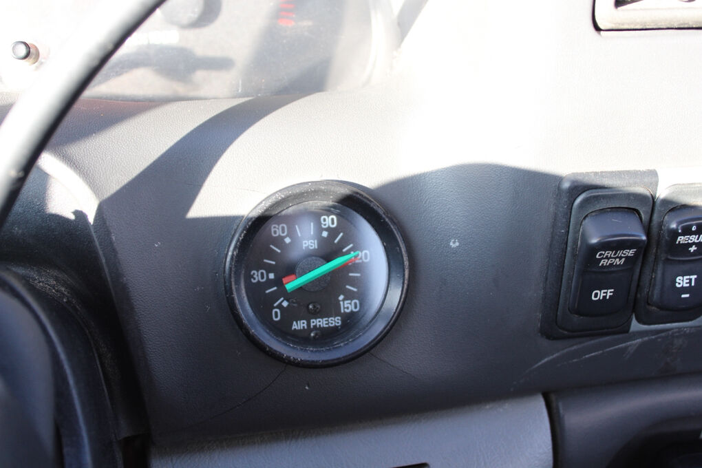 Inside, the cab is practical and durable with black Mastile-type flooring, color-coordinated trim, tilt steering column, and a full instrumentation cluster including speedometer, tachometer, volt meter, oil pressure, coolant temperature, and fuel gauges. Convenience features include cruise control, cup holders, auxiliary power point, dome lighting, and interior grab handles.