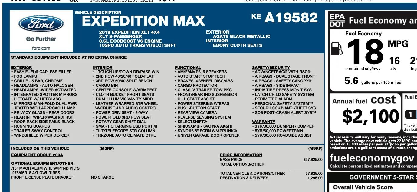 Aluminum Alloy With Painted Accents Wheels, Safety Reverse Power windows, Running boards, Heated windshield wiper rests, Power Side mirror adjustments, Heated Side mirrors, Acoustic Windshield Laminated glass, Daytime running lights, Front fog lights, Manual Flip-up Liftgate window, Puddle Lamps Exterior entry lights, Approach Lamps Exterior entry lights, Steel Spare wheel, Black Roof rails, Intermittent Rear wiper, Rear Window defogger, Rear privacy glass, With Washer Rear wiper, Tire Pressure Monitoring System, Front Solar-tinted glass, Full-size Spare tire size, Auto On/off Headlights, Chrome Window trim, Intermittent Front wipers, Auto Delay Off Headlights, Chrome Grille color, Chrome Surround Grille color, Wiper Activated Headlights, Liftgate Rear trunk/liftgate, Manual Folding Side mirror adjustments, Black Running board color, Proximity Entry System Multi-function remote, Automatic Climate Control Rear air conditioning, Leather Steering wheel trim, Automatic Climate Control Front air conditioning, Dual Front air conditioning zones, 8 Driver seat power adjustments, Independently Controlled Rear air conditioning, Push-button start, Garage Door Opener Universal remote transmitter, Auto-dimming Rearview mirror, Variable/speed-proportional Power steering, Cruise control, Cloth Upholstery, Bucket Front seat, Power Third row seat folding, Keypad entry, Keyless Entry Multi-function remote, 40-20-40 Split Bench Rear seat, 40-60 Split Bench Third row seat, Carpet Floor mat material, Fold Flat Into Floor Third row seat folding, Air filtration, Capless fuel filler system, Flat Rear seat folding, Split Third row seat folding, Split Rear seat folding, 12V Cargo Area Power outlet(s), 12V Rear Power outlet(s), 12V Front Power outlet(s), Tilt And Telescopic Steering wheel, Third Row Rear vents, Rear Floor mats, Front Floor mats, Multi-function display, Oil Pressure Gauge, Sliding Rear seat, Rubber/vinyl Cargo area floor mat, Front Console With Armrest And Storage Center console, 15 Cupholders, External temperature display, MPG Fuel economy display, Range Fuel economy display, Cargo Net Storage, Front Reading lights, Tachometer Gauge, Reclining Rear seat manual adjustments, Rear Reading lights, Lumbar Driver seat power adjustments, Third Row Reading lights, Height Driver seat power adjustments, 4.2 In. Instrument cluster screen size, Front Cupholders, Third Row Cupholders, Maintenance Due Warnings and reminders, Front Overhead console, Dual Illuminating Vanity mirrors, Conversation mirror, Rear Cupholders, Cargo area light, 2 One-touch windows, Panic Alarm Multi-function remote, Audio Steering wheel mounted controls, Cargo Tie-down Anchors And Hooks Storage, Carpet Floor material, Cruise Control Steering wheel mounted controls, Phone Steering wheel mounted controls, Multi-function Steering wheel mounted controls, Front Seatback Storage, Voice Control Steering wheel mounted controls, Single Rear air conditioning zones, Sunglasses Holder Storage, Trunk Release Multi-function remote, Straight Line And Turning Automated trailer backup steering, Trailer brake controller, Class IV Trailer hitch, Auto start/stop, Electronic Hi-lo 4WD selector, Part Time W/ On Demand Setting 4WD, 4-pin Trailer wiring, 7-pin Trailer wiring, Front Tow hooks, Drive mode selector, 650 CCA Battery rating, Independent Front suspension classification, Independent Rear suspension classification, Multi-link Rear suspension, Front struts, Rear struts, Short And Long Arm Front suspension, 150 Amps Alternator, Diameter 36 Mm Front stabilizer bar, Rear stabilizer bar, Tow/Haul mode, Battery saver, Apple CarPlay Smartphone integration, Android Auto Smartphone integration, Bluetooth Wireless data link, Voice Operated Hands-free phone call integration, Voice Operated Radio, Bluetooth Auxiliary audio input, 8 In. Infotainment screen size, Touch Screen Display Radio, App Marketplace Integration Connected in-car apps, With Read Function Electronic messaging assistance, Voice Operated Electronic messaging assistance, SiriusXM Satellite radio, 6 Total speakers, USB Auxiliary audio input, IPod/iPhone Auxiliary audio input, SYNC Infotainment, AM/FM Radio, Speed sensitive volume control, Google POIs Connected in-car apps, Google Search Connected in-car apps, Rearview Camera system, Front Side airbags, Rear Side curtain airbags, Front Side curtain airbags, Third Row Side curtain airbags, Rear Parking sensors, 4-wheel ABS, Auto-locking Power door locks, Rear Camera system washer, Programmable safety key, Hill Descent Off-road driving assist, Perimeter Alarm Anti-theft system, Trailer stability control, Ventilated Disc Rear brake, Alarm Anti-theft system, Braking assist, Hill holder control, Ventilated Disc Front brake, Dual Front airbags, Vehicle Immobilizer Anti-theft system, Power brakes, LATCH System Child seat anchors, Electronic brakeforce distribution, Stability control, Traction control, In Dash Rearview monitor, Occupant Sensing Passenger Airbag deactivation, Front Seatbelt pretensioners, Front Seatbelt force limiters, Front Emergency locking retractors, Post-collision Safety System Impact sensor, Door Unlock Impact sensor, Rear Emergency locking retractors, Roll stability control, Front Seatbelt warning sensor