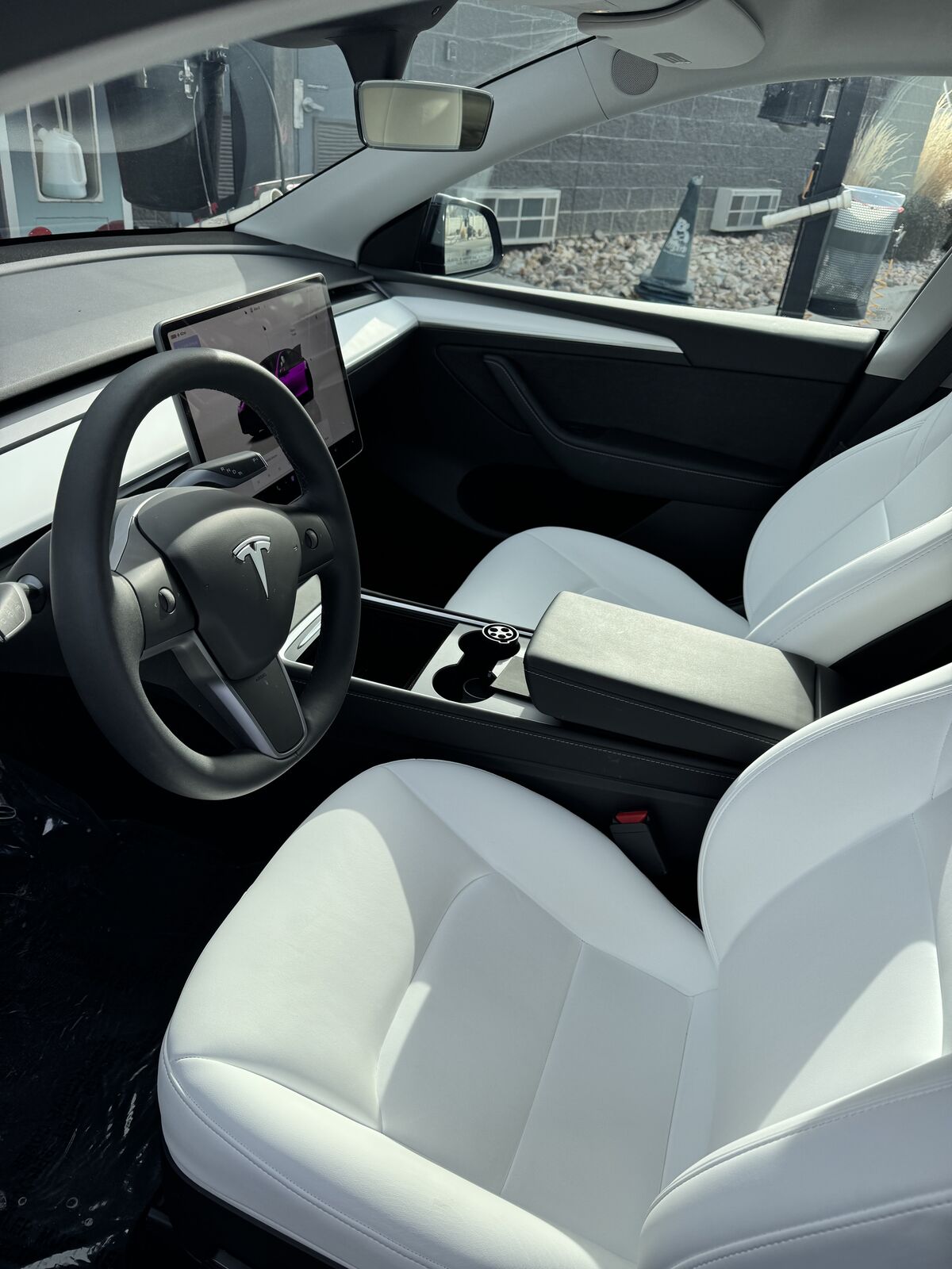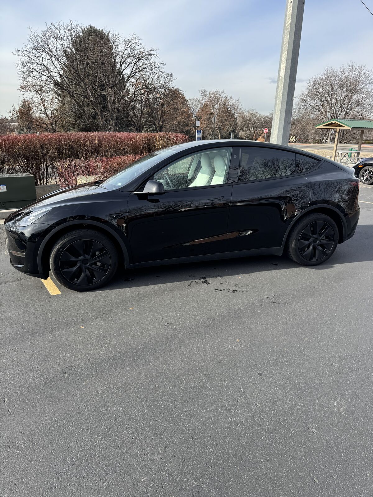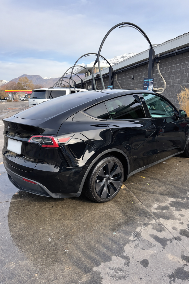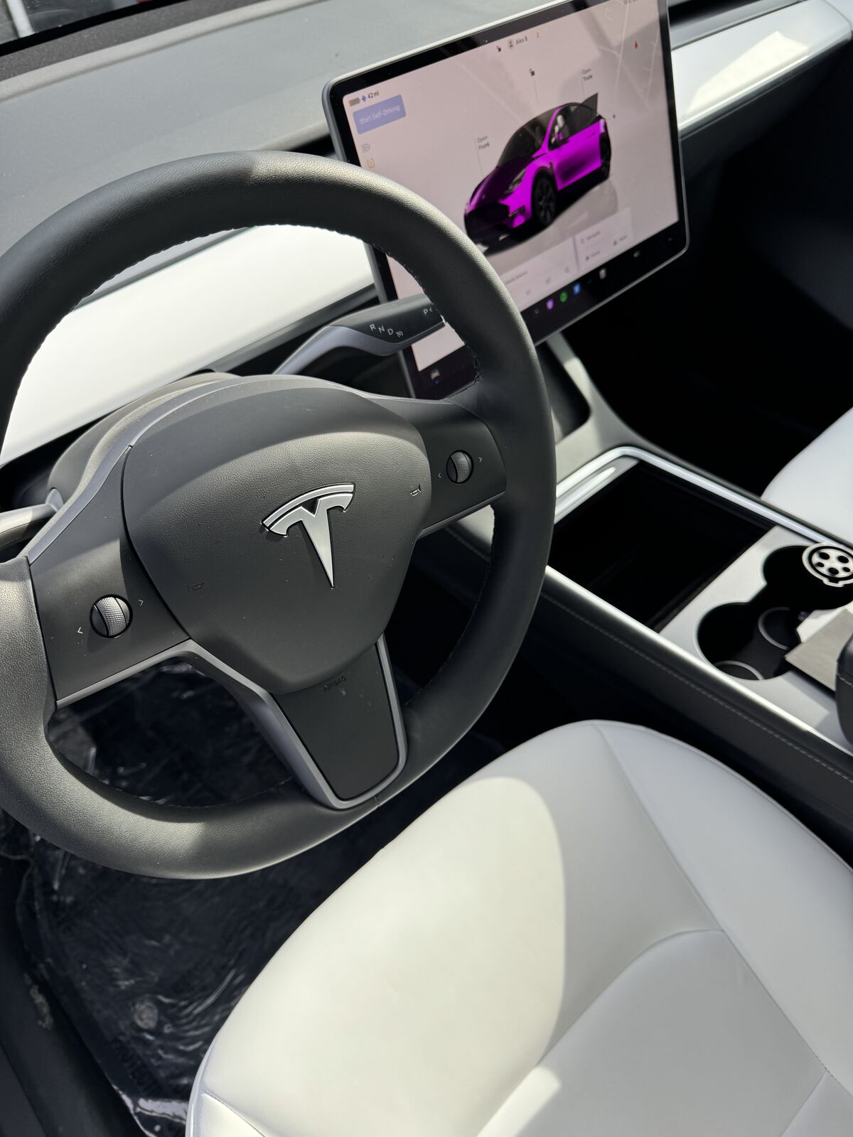 2025 Tesla Model Y Long Range in black with a premium white interior. Equipped with Full Self-Driving capability (subscription required) and a desirable 7-seat configuration. Exceptionally well maintained with under 5,000 miles, offering excellent range, advanced safety features, and versatile seating for families or road trips.