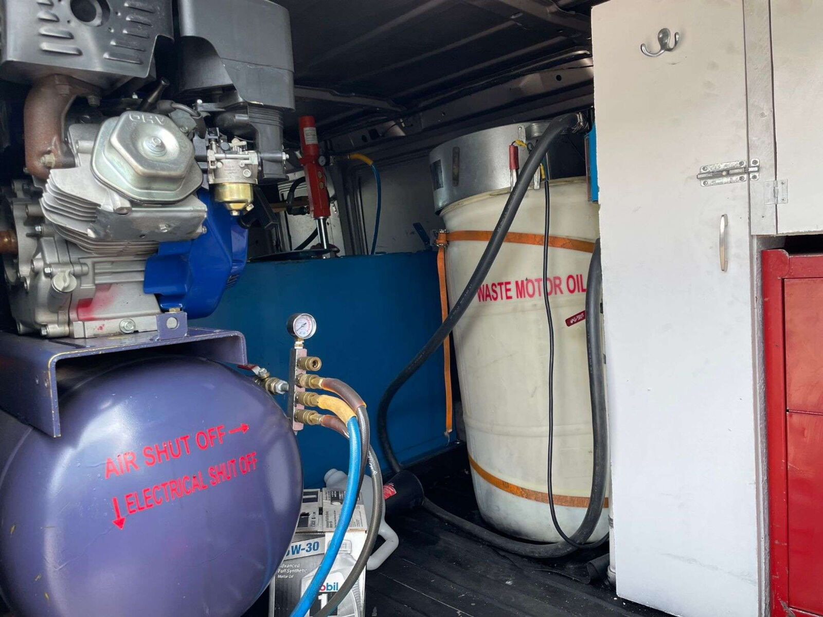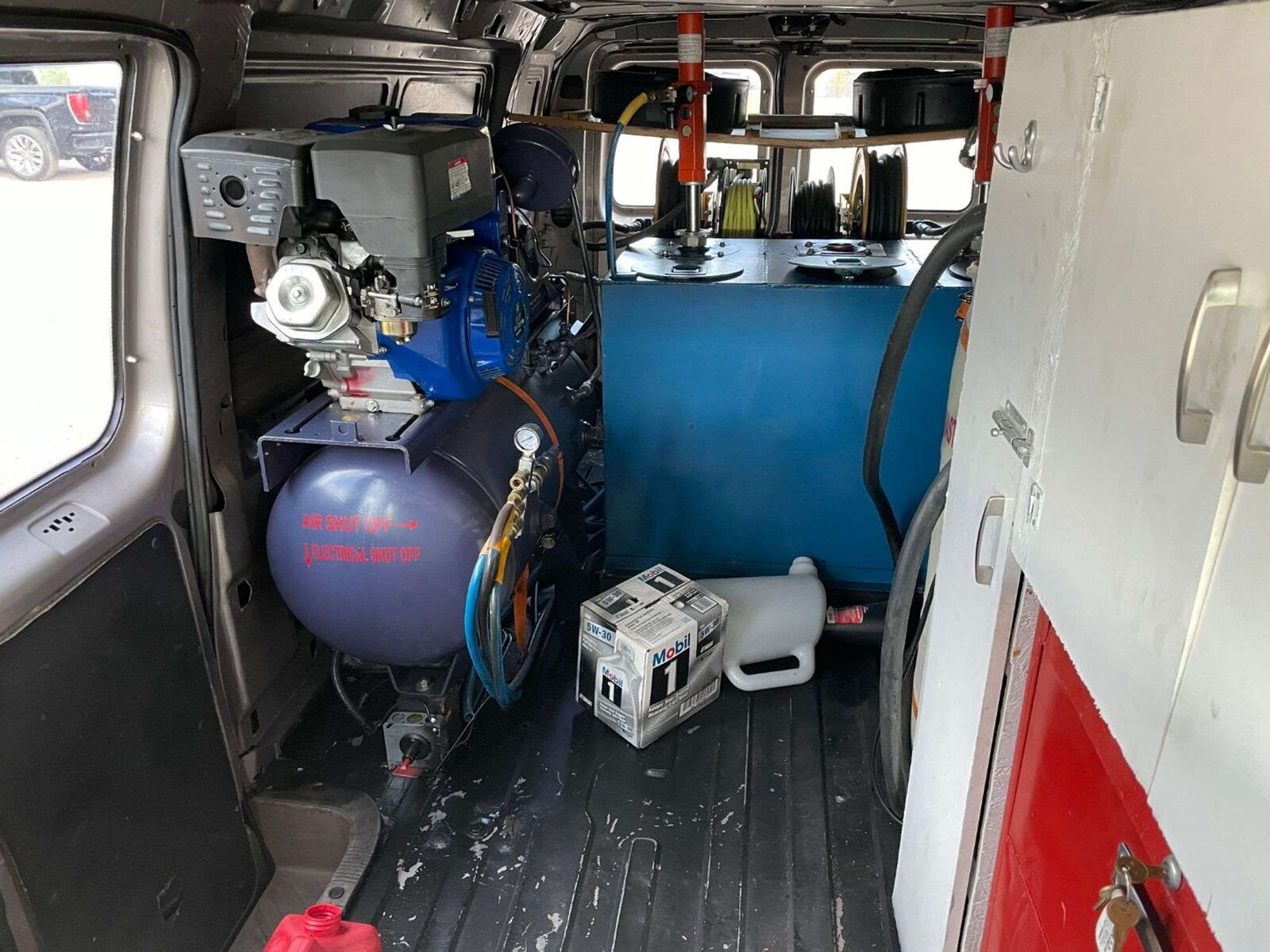 The van includes an air compressor, mounted air hose holders, used oil collection containers, and all the basic infrastructure needed to start servicing vehicles immediately. Just add your hand tools, oil, and filters, and a few other basic supplies and you’re in business.