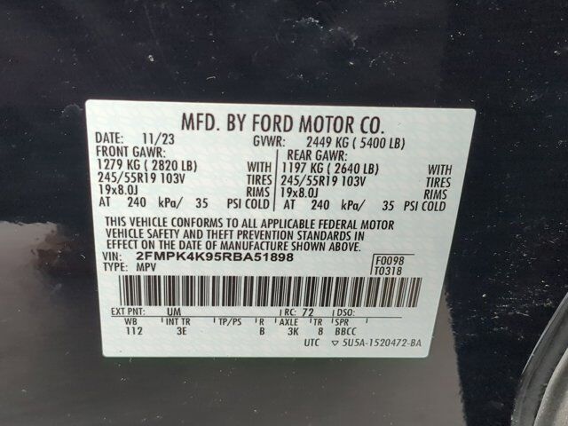 ENGINE: TWIN-SCROLL 2.0L ECOBOOST -inc: auto start-stop technology (STD),Turbocharged,All Wheel Drive,Power Steering,ABS,4-Wheel Disc Brakes,Brake Assist,Brake Actuated Limited Slip Differential,Aluminum Wheels,Tires - Front Performance,Tires - Rear Performance,Heated Mirrors,Power Mirror(s),Integrated Turn Signal Mirrors,Rear Defrost,Privacy Glass,Intermittent Wipers,Variable Speed Intermittent Wipers,Rain Sensing Wipers,Rear Spoiler,Remote Trunk Release,Power Liftgate,Power Door Locks,Daytime Running Lights,Automatic Headlights,LED Headlights,Automatic Highbeams,Fog Lamps,AM/FM Stereo,Premium Sound System,Satellite Radio,MP3 Capability,Auxiliary Audio Input,HD Radio,Requires Subscription,MP3 Capability,Steering Wheel Audio Controls,Satellite Radio,Requires Subscription,MP3 Capability,Bluetooth Connection,Telematics,Auxiliary Audio Input,Smart Device Integration,Requires Subscription,Bluetooth Connection,Pass-Through Rear Seat,Rear Bench Seat,Adjustable Steering Wheel,Trip Computer,Power Windows,WiFi Hotspot,Leather Steering Wheel,Heated Steering Wheel,Keyless Entry,Power Door Locks,Keyless Start,Keyless Entry,Power Door Locks,Hands-Free Liftgate,WiFi Hotspot,Smart Device Integration,Requires Subscription,Universal Garage Door Opener,Cruise Control,Climate Control,Multi-Zone A/C,A/C,Power Driver Seat,Power Passenger Seat,Bucket Seats,Heated Front Seat(s),Driver Adjustable Lumbar,Seat Memory,Premium Synthetic Seats,Driver Vanity Mirror,Passenger Vanity Mirror,Driver Illuminated Vanity Mirror,Passenger Illuminated Visor Mirror,Auto-Dimming Rearview Mirror,Floor Mats,Smart Device Integration,Remote Engine Start,Keyless Start,Mirror Memory,Seat Memory,Power Windows,Power Door Locks,Trip Computer,Mirror Memory,Seat Memory,Immobilizer,Security System,Traction Control,Stability Control,Traction Control,Front Side Air Bag,Telematics,Requires Subscription,Blind Spot Monitor,Cross-Traffic Alert,Lane Departure Warning,Lane Keeping Assist,Lane Departure Warning,Front Collision Mitigation,Driver Monitoring,Rear Parking Aid,Tire Pressure Monitor,Driver Air Bag,Passenger Air Bag,Front Head Air Bag,Rear Head Air Bag,Passenger Air Bag Sensor,Knee Air Bag,Driver Restriction Features,Child Safety Locks,Back-Up Camera