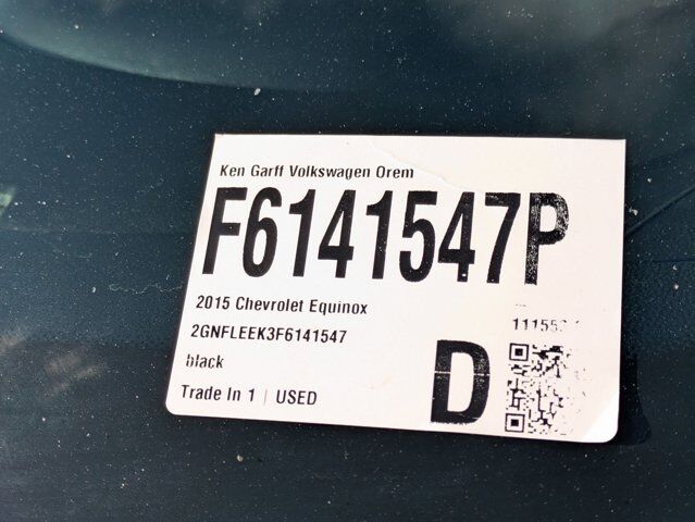 Ken Garff Volkswagen is excited to offer this good-looking 2015 Chevrolet Equinox LS in Black.17 Aluminum Wheels, 3.53 Axle Ratio, 4-Wheel Disc Brakes, 6 Speakers, ABS brakes, Air Conditioning, Alloy wheels, AM/FM radio: SiriusXM, Brake assist, Bumpers: body-color, Cargo Area Close-Out Panel (LPO), CD player, Cloth Seat Trim, Compass, Delay-off headlights, Deluxe Front Bucket Seats, Driver door bin, Driver vanity mirror, Dual front impact airbags, Dual front side impact airbags, E85 FlexFuel Capable, Electronic Stability Control, Emergency communication system: OnStar Directions & Connections, Equipment Group 1LS, Four wheel independent suspension, Front anti-roll bar, Front Bucket Seats, Front Center Armrest, Front License Plate Bracket, Front reading lights, Fully automatic headlights, Illuminated entry, Low tire pressure warning, Occupant sensing airbag, Outside temperature display, Overhead airbag, Panic alarm, Passenger door bin, Passenger vanity mirror, Power door mirrors, Power driver seat, Power steering, Power windows, Radio data system, Radio: AM/FM Stereo w/CD Player & MP3 Capability, Rear anti-roll bar, Rear seat center armrest, Rear window defroster, Rear window wiper, Remote keyless entry, Security system, SiriusXM Satellite Radio, Speed control, Speed-sensing steering, Split folding rear seat, Spoiler, Steering wheel mounted audio controls, Tachometer, Telescoping steering wheel, Tilt steering wheel, Traction control, Trip computer, Variably intermittent wipers. Odometer is 4290 miles below market average!20/29 City/Highway MPGAwards: * JD Power Initial Quality Study, JD Power Dependability Study * JD Power Initial Quality Study * 2015 IIHS Top Safety Pick * 2015 KBB.com 10 Best Used Family Cars Under $15,000 * 2015 KBB.com 10 Best Used Compact SUVs Under $15,000Buy with Confidence at Ken Garff Volkswagen! All of our used vehicles go through a rigorous 150 point inspection by our master certified technicians. All of our prices are based off market conditions to be the best value for our customers! We are conveniently located at 115 E University Parkway in Orem, UT 84058. Just 1 Block west of University Mall. Additional Ken Garff VW benefits include: -- A Better Business Rating --Lifetime Garff Care. This includes roadside assistance and towing along the Wasatch Front for as long as you own your car. --Car Fax on every used vehicle. --No Hassle 3-Day Exchange on every new or used vehicle.Reviews: * If you haul rear-seat passengers more often than you fill the cargo area in your compact SUV, then you might want to give the 2015 Chevy Equinox a look. The ability to tow 3,500 pounds in V6 models is shoulders above most competitors. Source: KBB.com * Premium look inside and out; strong optional V6 engine; quiet interior; comfortable highway ride; spacious and adjustable backseat. Source: Edmunds