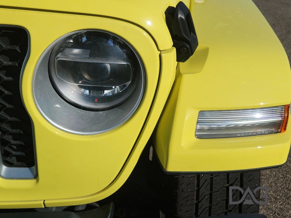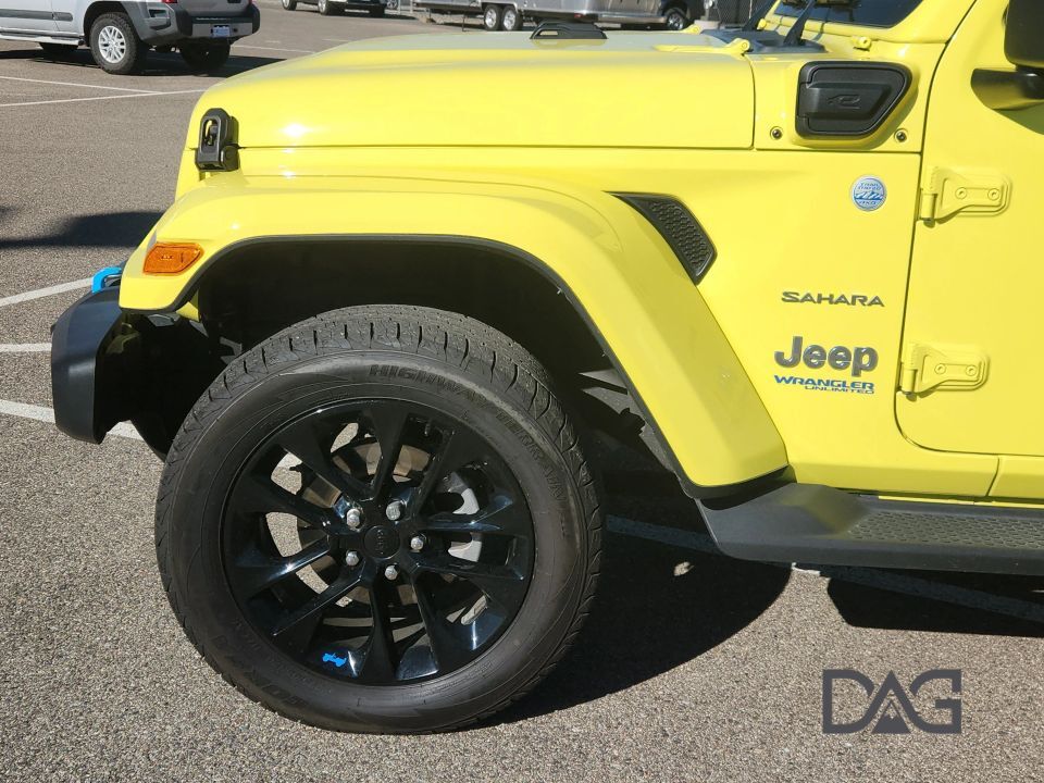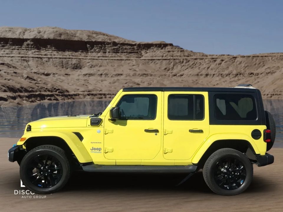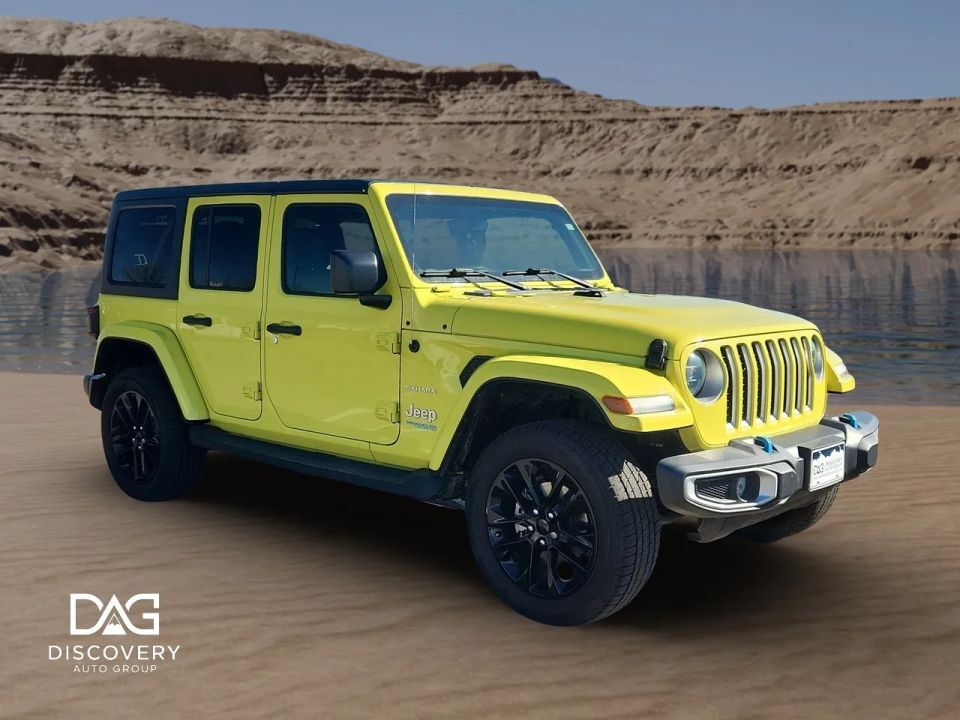 Presenting the 2022 Jeep Wrangler Unlimited 4xe Sahara 4xe Sport Utility 4D, an SUV that commands attention with its striking yellow exterior and sophisticated black interior. This refined vehicle is designed to offer both impressive capability and contemporary style, ensuring a distinguished driving experience for those who value both form and function.