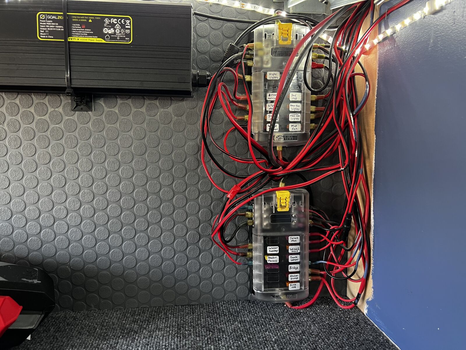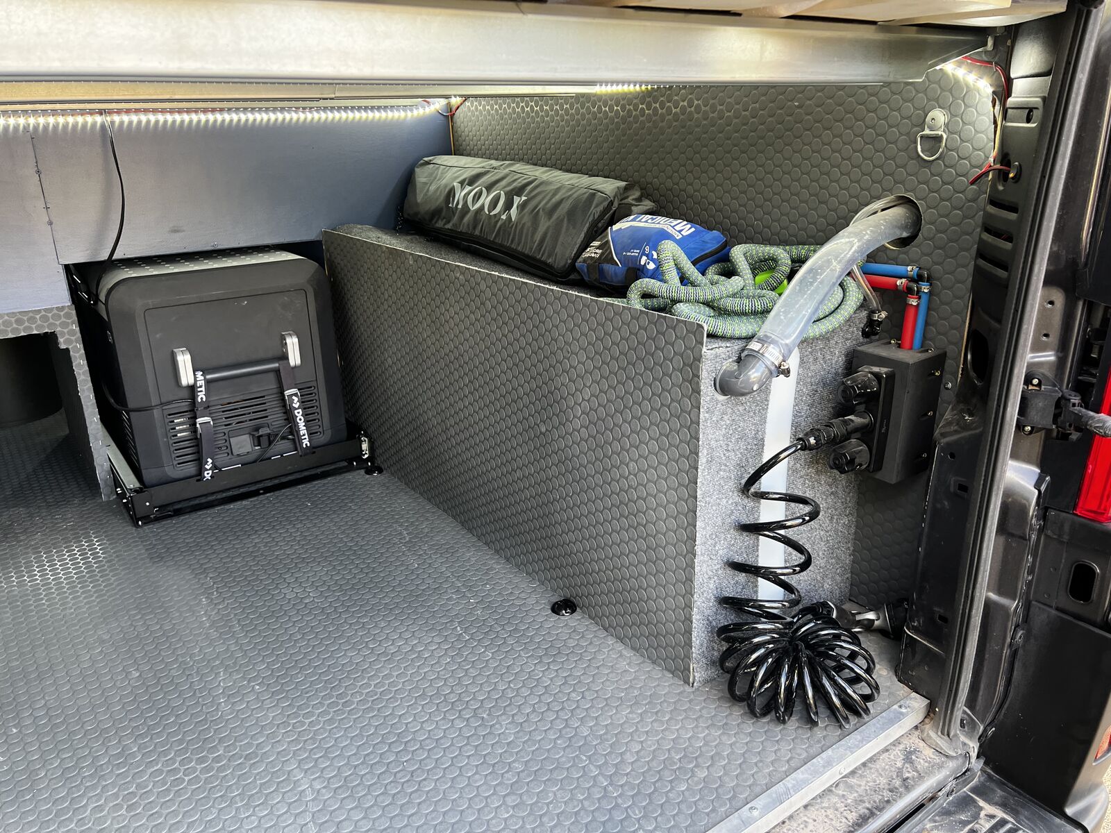 Exterior lighting on both sides and rear of vehicle and in the "garage" below the bed.