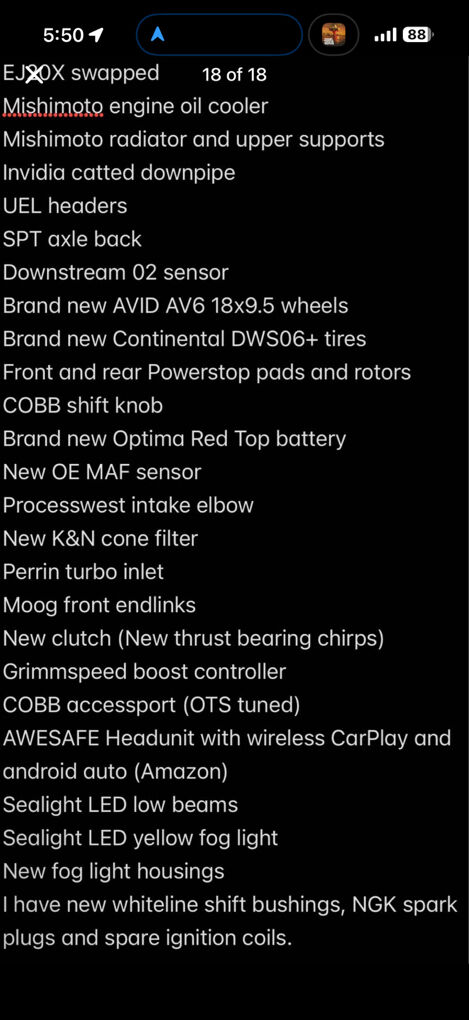 Selling my EJ20X swapped 2013 WRX. Body has 65k miles and engine has around 40k on it. Front end paint needs some love but the rest of the paint is in decent shape for the year. Car is “modded”, engine is bone stock. See last pic for parts list. $9,000 OBO. NO TRADES.