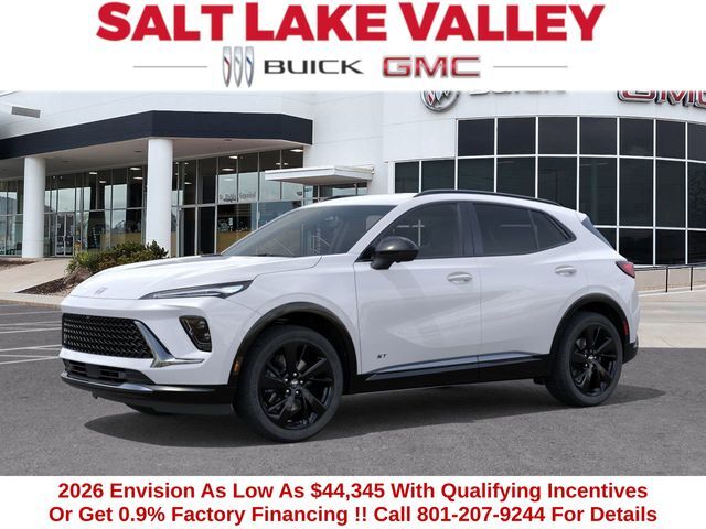 2026 Buick Envision Sport Touring 4D Sport Utility Summit White 2.0L Turbocharged AWD 22/28 City/Highway MPG --- Please note that the final selling price does not include tax, tag, title, documentation fees, dealer-installed options, or pricing adjustments due to market demand. Financing through GM Financial is required for all discounts to be applied. Special finance offers may not be combined with some factory incentives. While we strive for accuracy, errors may occur, so please verify all information with a customer service representative. For the most accurate pricing, call us at (801) 265-1511 or visit our dealership in person. Prices and payments are subject to change based on manufacturer incentives. ... Sale Price may include dealer discount, - Price includes $1,000 Down Payment Assistance. Must Finance with GM Financial – - Price includes $1,500 trade in allowance program for customers that own a 2019 or newer passenger car or truck with less than 80,000 miles and trade in their vehicle towards the purchase of a new 2025-2026 Buick or GMC. Some restrictions may apply. Contact dealer for details –