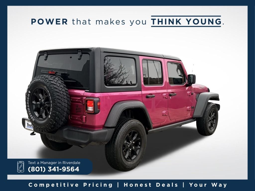 The 2022 Jeep Wrangler Unlimited Willys is a rugged, trail-ready four-door SUV that combines iconic Jeep capability with enhanced off-road performance and distinctive styling. Built to handle tough terrain with confidence, it features trail-focused suspension, aggressive tires, and Willys-specific design cues that give it extra traction and a bold look. The spacious Unlimited cabin offers room for passengers and gear, while modern conveniences make daily driving comfortable and enjoyable. Whether you’re hitting the trails or cruising around town, this Wrangler Unlimited Willys delivers legendary Jeep adventure with everyday versatility.