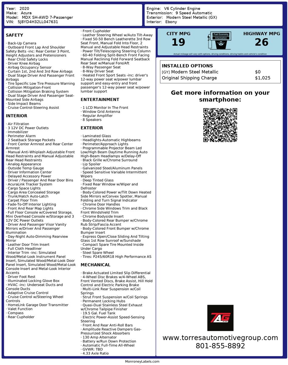 The 2020 Acura MDX SH-AWD 7-Passenger in Modern Steel Metallic embodies a perfect blend of sophistication and performance. Its sleek- aerodynamic lines and bold grille ensure it stands out on the road- while the deep gray hue of its exterior gives it a refined and contemporary look. Designed to command attention- this SUV offers a spacious interior that comfortably accommodates seven passengers- making it an ideal choice for families and those who appreciate a touch of luxury in their everyday drives.