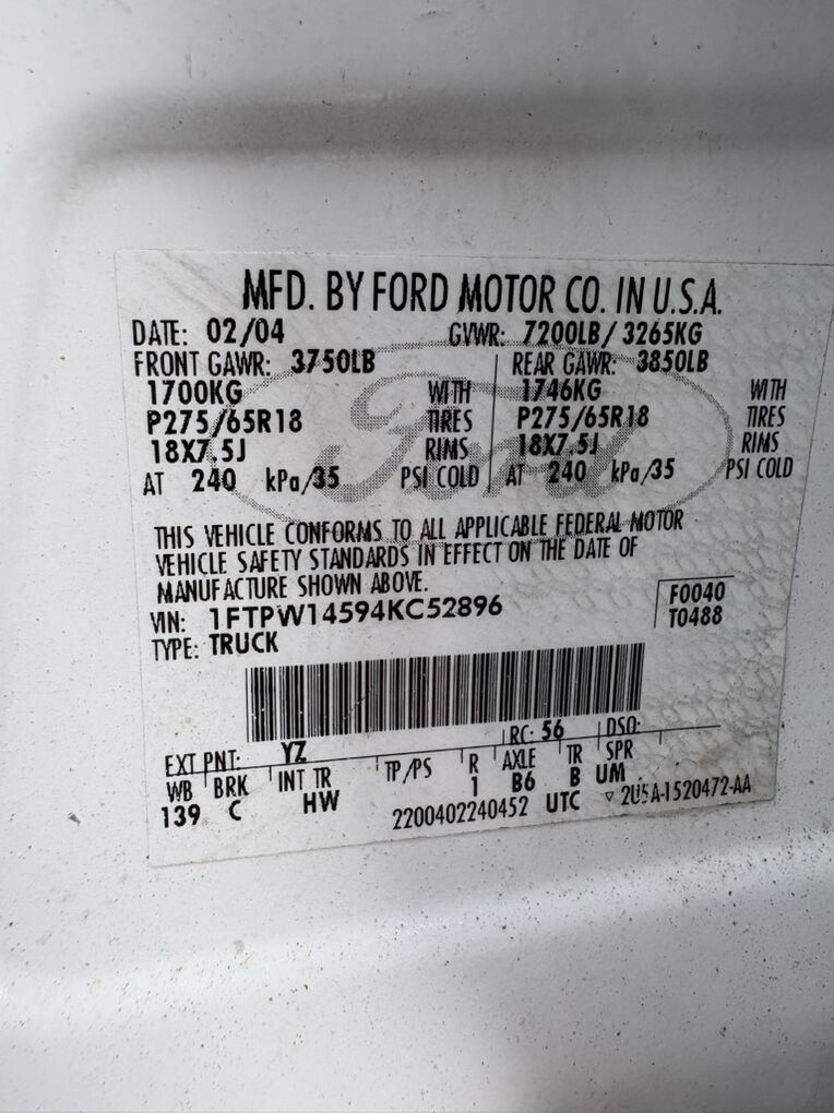 • VIN: 1FTPW14594KC52896