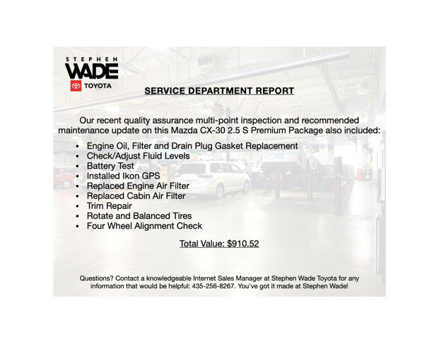 CLEAN CARFAX. 2022 Mazda CX-30 2.5 S Premium Package AWD in Snowflake White Pearl Mica with Black Leather. SKYACTIV-G 2.5L DOHC 4-Cylinder Engine, SKYACTIV-DRIVE 6-Speed Sport-Mode Automatic Transmission, I-ACTIV All-Wheel Drive.Odometer is 7,911 miles below market average!24/31 City/Highway MPG.CALL STEPHEN WADE TOYOTA: 435-241-3828.PREMIUM PACKAGE.BOSE Audio.All-Weather High-Wall Floor Mats.Snowflake White Pearl Paint.Frameless Auto Dimming Mirror w/HomeLink.SERVICE REPORT: At Stephen Wade Toyota, we do more to insure we offer the most mechanically sound pre-owned vehicles with maintenance that is up to date. Our recent quality assurance multi-point inspection and recommended maintenance update on this Mazda CX-30 2.5 S Premium also included an engine oil, filter and drain plug gasket replacement, check/adjust fluid levels, battery test, installed Ikon GPS, replaced engine air filter, replaced cabin air filter, trim repair, rotate and balanced tires and a four wheel alignment check - a $910.52 value.MARKET REPORT: We use advanced software to shop the automotive marketplace nationwide everyday. This allows us to competitively offer you the best value one can find anywhere. Contact our knowledgeable Internet sales managers; Danny, Jessica or Wesley at Stephen Wade Toyota for a priority test drive, or for any information that would be helpful: 435-241-3828. You've got it made at Stephen Wade!