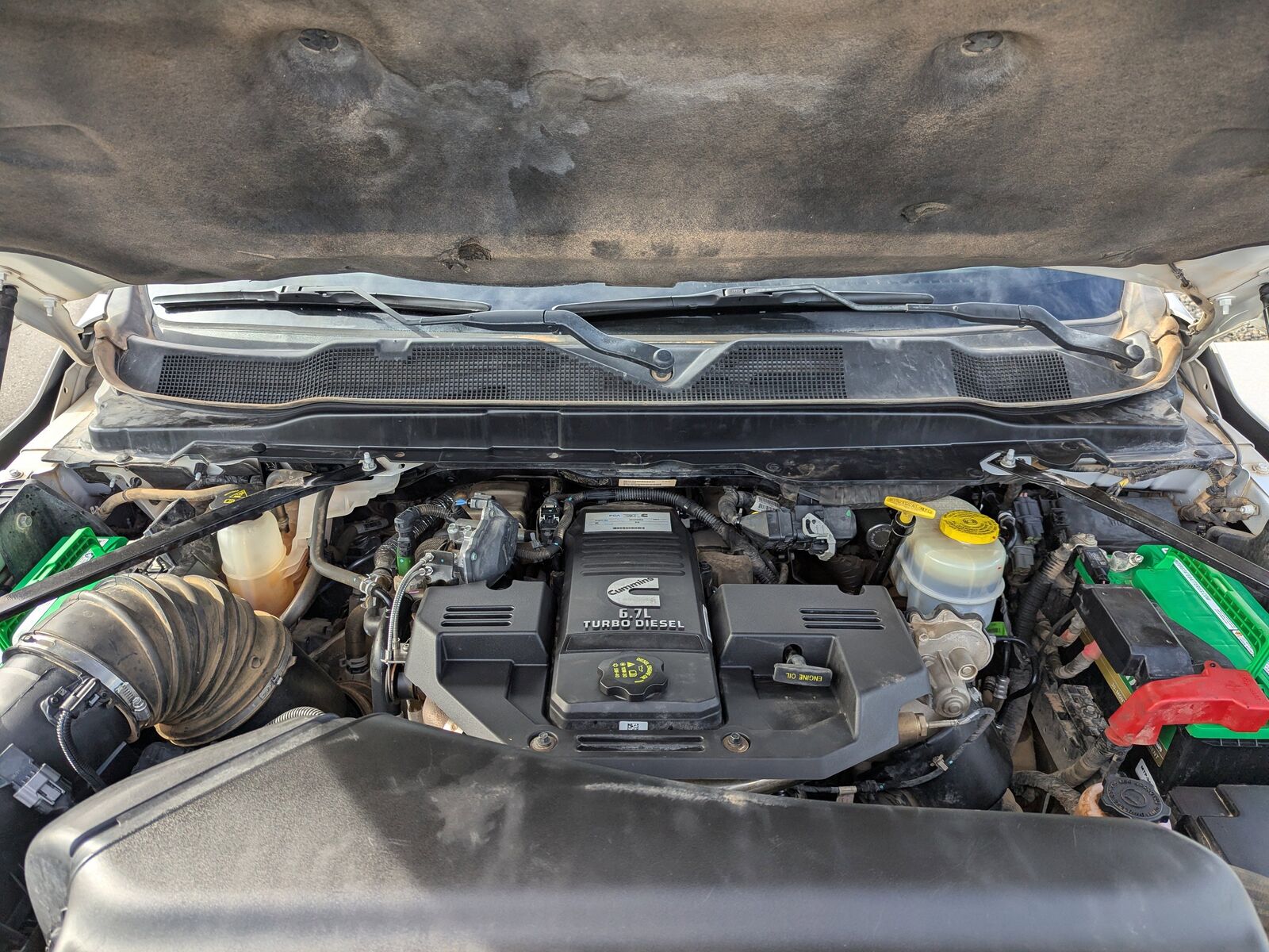 MOPAR SPRAY IN BEDLINER,BRIGHT WHITE CLEARCOAT,CHROME APPEARANCE GROUP -inc: Bright Rear Bumper Chrome Grille Surround Matte Black Mesh w/Chrome Grille Bright Front Bumper,50 GALLON FUEL TANK,TIRES: LT275/70R18E BSW AS (STD),GVWR: 12 300 LBS,WHEELS: 18 X 8.0 STEEL CHROME CLAD,ENGINE: 6.7L I6 CUMMINS HO TURBO DIESEL -inc: Selective Catalytic Reduction (Urea) Dual 730 Amp Maintenance Free Batteries Cummins Turbo Diesel Badge Heavy Duty Engine Cooling Current Generation Engine Controller Diesel Exhaust Brake Supplemental Heater Capless Fuel Fill w/o Discriminator GVWR: 12 300 lbs,3.73 AXLE RATIO (STD),TRANSMISSION: 6-SPEED AUTOMATIC AISIN AS69RC HD -inc: 12.0 Single Rear Wheel Axle Urethane Shift Control Transmission Oil Cooler,DIESEL GRAY/BLACK HD VINYL 40/20/40 SPLIT BENCH SEAT,MANUFACTURER'S STATEMENT OF ORIGIN,TRAILER BRAKE CONTROL -inc: Trailer Light Check,5TH WHEEL/GOOSENECK TOWING PREP GROUP,I/P MOUNTED AUXILIARY SWITCHES -inc: Dash Pass Thru Wire Circuits,QUICK ORDER PACKAGE 21A TRADESMAN -inc: Engine: 6.7L I6 Cummins HO Turbo Diesel Transmission: 6-Speed Automatic Aisin AS69RC HD,FRONT LICENSE PLATE BRACKET,Four Wheel Drive,Tow Hitch,Power Steering,ABS,4-Wheel Disc Brakes,Brake Assist,Locking/Limited Slip Differential,Steel Wheels,Conventional Spare Tire,Tow Hooks,Heated Mirrors,Power Mirror(s),Integrated Turn Signal Mirrors,Intermittent Wipers,Variable Speed Intermittent Wipers,Privacy Glass,Power Door Locks,Daytime Running Lights,Automatic Headlights,AM/FM Stereo,Bluetooth Connection,MP3 Capability,Auxiliary Audio Input,Adjustable Steering Wheel,Power Windows,Rear Bench Seat,Keyless Start,Keyless Entry,Power Door Locks,Cruise Control,A/C,Vinyl Seats,Split Bench Seat,Passenger Vanity Mirror,Bluetooth Connection,Power Door Locks,Power Windows,Split Bench Seat,Immobilizer,Traction Control,Stability Control,Traction Control,Front Side Air Bag,Tire Pressure Monitor,Driver Air Bag,Passenger Air Bag,Passenger Air Bag Sensor,Front Head Air Bag,Rear Head Air Bag,Child Safety Locks,Back-Up Camera